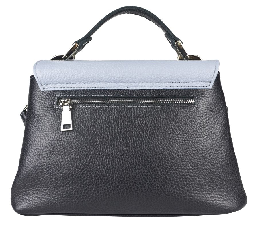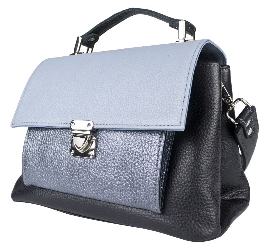 Женская сумка Agliano (Альяно) выполнена из натуральной кожи черного, голубого и серебристого цветов. Сумка состоит из двух отделений под клапаном. Первое отделение на молнии. Внутри карман на молнии. Второе отделение - открытое под клапаном. Внутри карман для мелочей. Под клапаном спереди карман на кнопке. Сзади - карман на молнии. Кожаный ремень в комплекте короткий. Для ношения на предплечье или недолгого ношения на плече.
