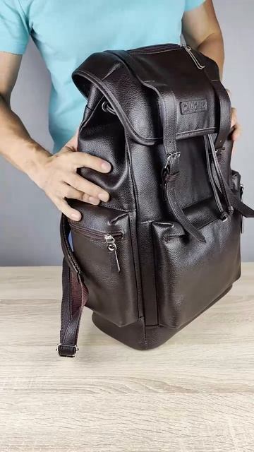 Кожаный рюкзак Voltaggio (Вольтаджио) выполнен из натуральной кожи темно-коричневого цвета. Рюкзак сочетает в себе вместительность торбы и практичность делового рюкзака для ноутбука. Состоит из объемного отделения под клапаном на кожаном шнурке и уплотненного отделения на молнии со стороны спинки. Клапан закрывается портфельными цупферными замками и регулируется по длине в пределах 8 см. - В большом отделении есть карман на молнии, открытый карман для документов и отделение для ноутбука с диагональю до 15,6 дюймов (26х38 см). В основное же отделение помещается ноутбук с диагональю до 17,3 дюйма. - В отделении на молнии есть карман для документов, открытый карман, 2 отсека для авторучек и отделение для ноутбука с диагональю до 14 дюймов (25х34 см). Спинка сделана из сетчатого вентилируемого материала и уплотнена. Лямки регулируются по длине, сделаны мягкими с вентилируемой сеткой сзади. По бокам два вместительных кармана на молнии. Спереди - накладной карман на молнии. Размеры рюкзака без карманов - 47х30х20 см. За счет регулируемого клапана вместительность рюкзака существенно увеличивается. Видеообзор рюкзака:
