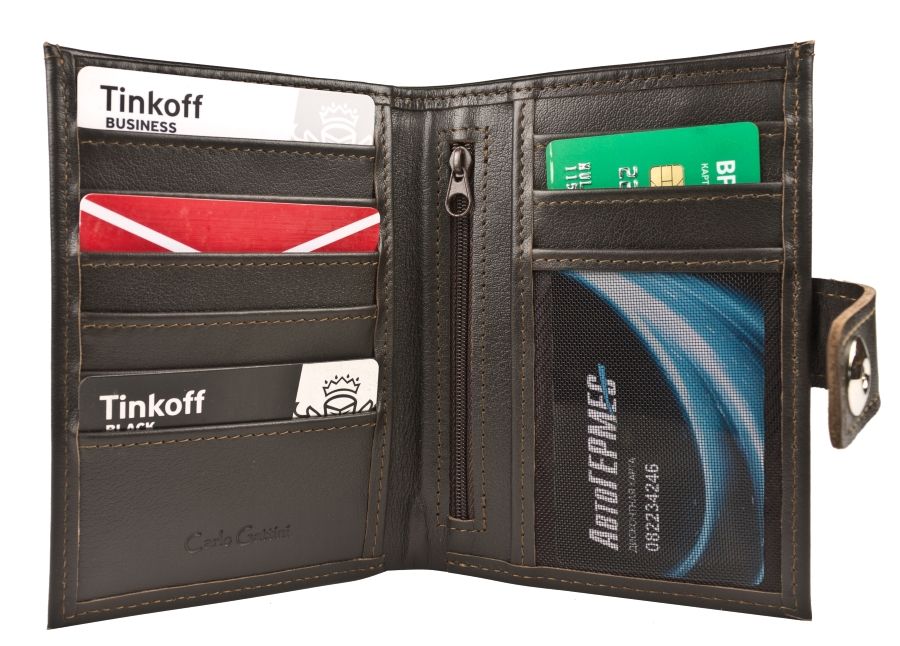 Кожаное портмоне Coste (Косте) выполнено из натуральной кожи темно-коричневого цвета. Внутри большое отделение для купюр, 9 карманов для карт (один с прозрачным окном), 2 кармана для документов и карман на молнии для мелочи. Закрывается на магнитную кнопку.