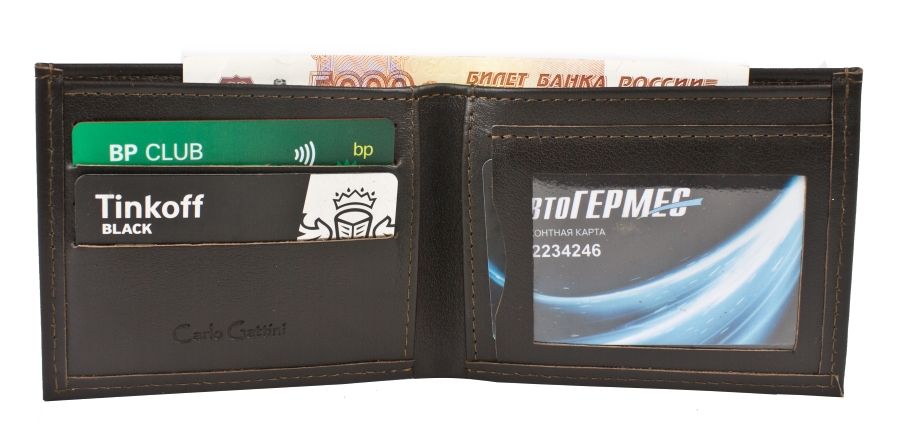 Кожаное портмоне Sano (Сано) выполнено из натуральной кожи темно-коричневого цвета. Внутри отделение для купюр, 7 карманов для карт (один с прозрачным окошком).