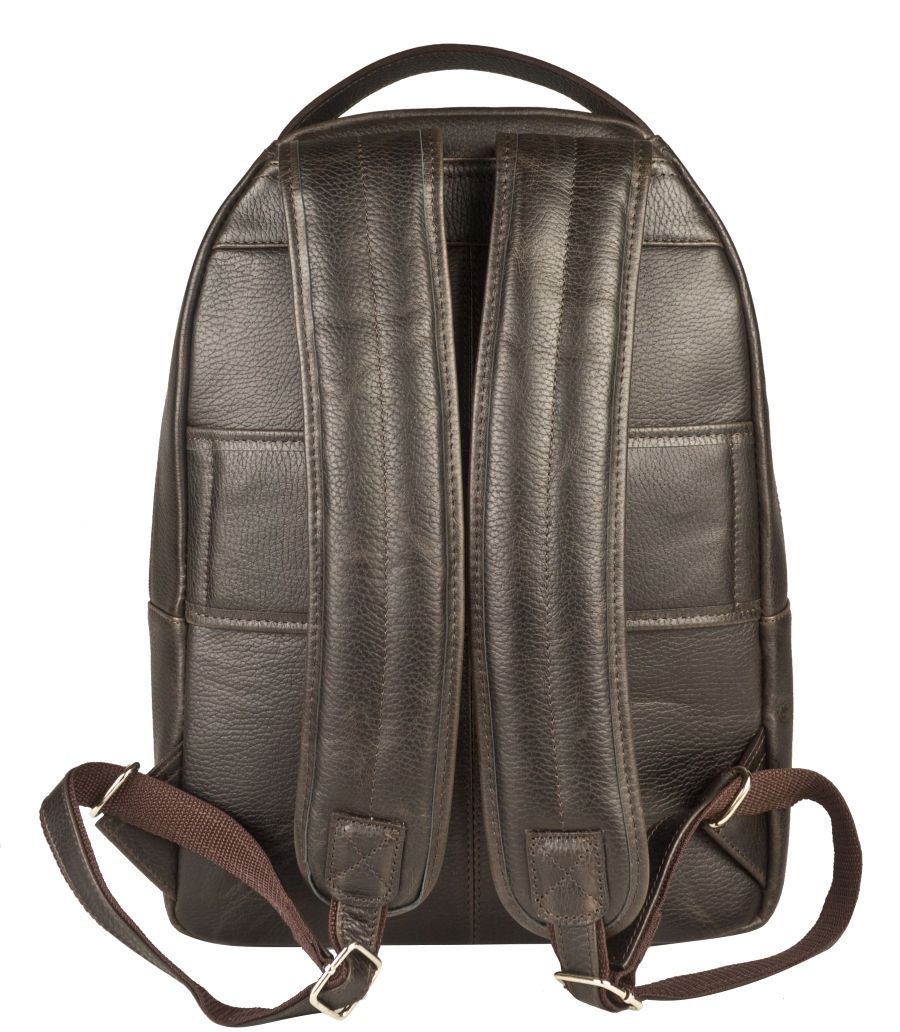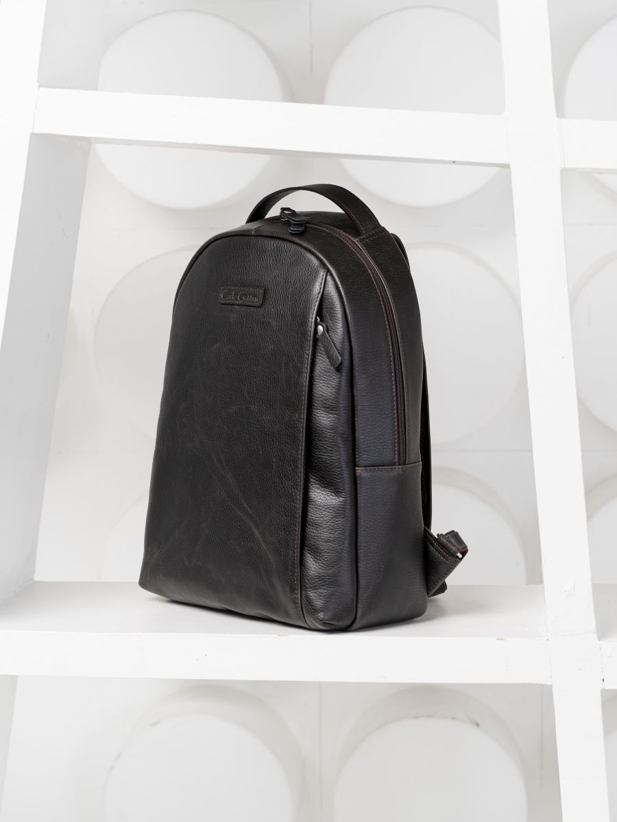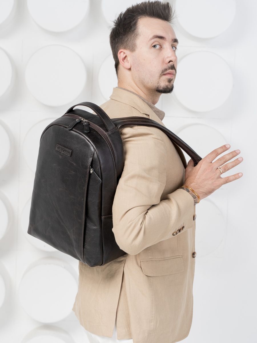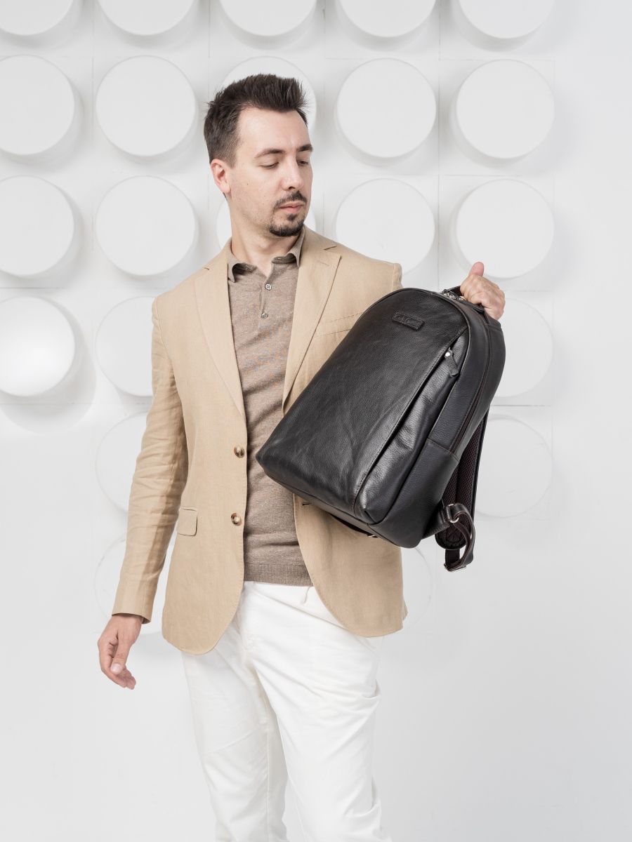 Кожаный рюкзак Ferramonti (Феррамонти) выполнен из натуральной кожи темно-коричневого цвета. Это классический лаконичный рюкзак среднего размера, идеально подходит для ежедневной эксплуатации. Сочетается с любой одеждой. Состоит из основного отделения, внутри которого 2 открытых кармана, карман на молнии и отделение для ноутбука с диагональю до 14 дюймов. Спереди есть вместительный карман на молнии, внутри которого открытый карман-сетка и карман на молнии. Спинка сделана полностью из натуральной кожи и уплотнена. На спинке есть крепление на ручку чемодана. Лямки шириной 7 см регулируются по длине, сделаны мягкими с вентилируемой сеткой сзади. Видеобзор рюкзака: