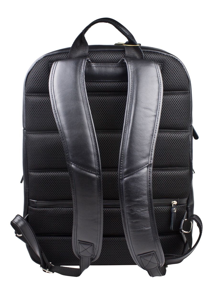 Кожаный рюкзак Vicoforte (Викофорте) выполнен из натуральной кожи черного цвета. Это очень большой и вместительный рюкзак для ноутбука, который может выполнить практически любую задачу своего владельца. Состоит из двух объемных отделений на молнии. Внутрь одного (ближе к спинке) помещается ноутбук с диагональю до 17,3 дюйма. Внутри второго карман на молнии, открытые карманы. Спереди: карман на молнии 27х22 см. Сзади: карман на молнии 30х14 см Сверху: карман на молнии 16х13 см По бокам: карманы на молнии 18х12 см. Спинка выполнена из мягкого сетчатого материала для вентиляции. Видеообзор рюкзака:
