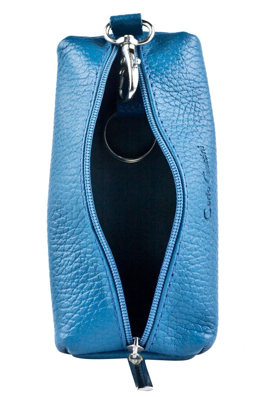 Ключница Cavone (Кавоне) выполнена из натуральной кожи голубого цвета с бирюзовым оттенком. Внутри кольцо для ключей, снаружи карабин.
