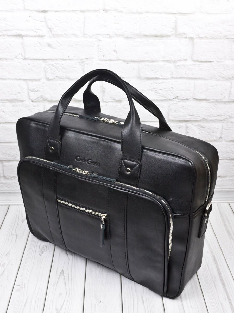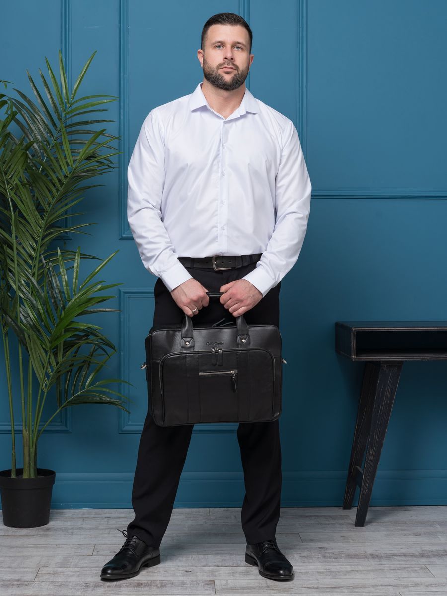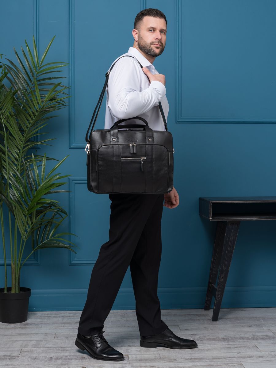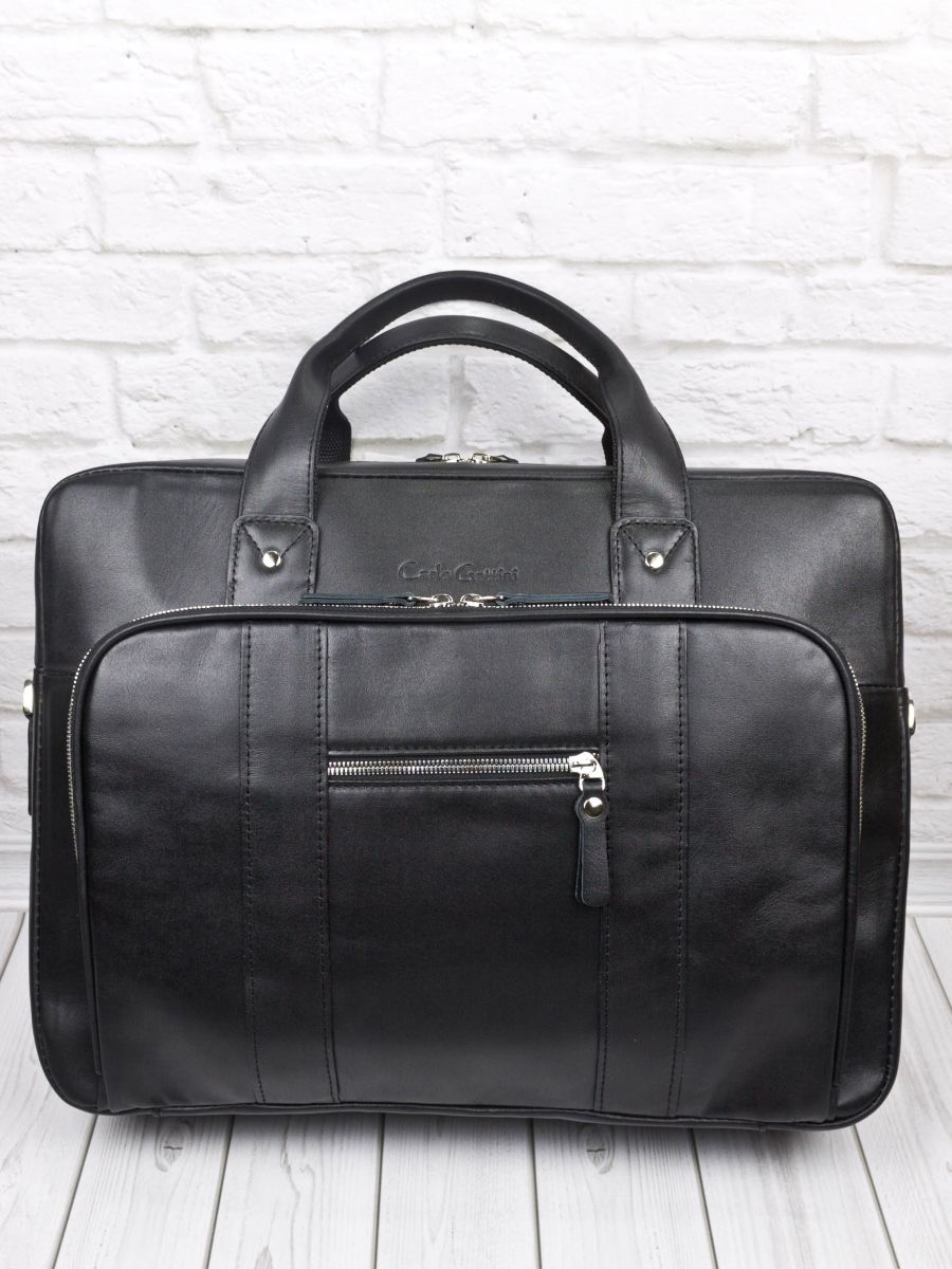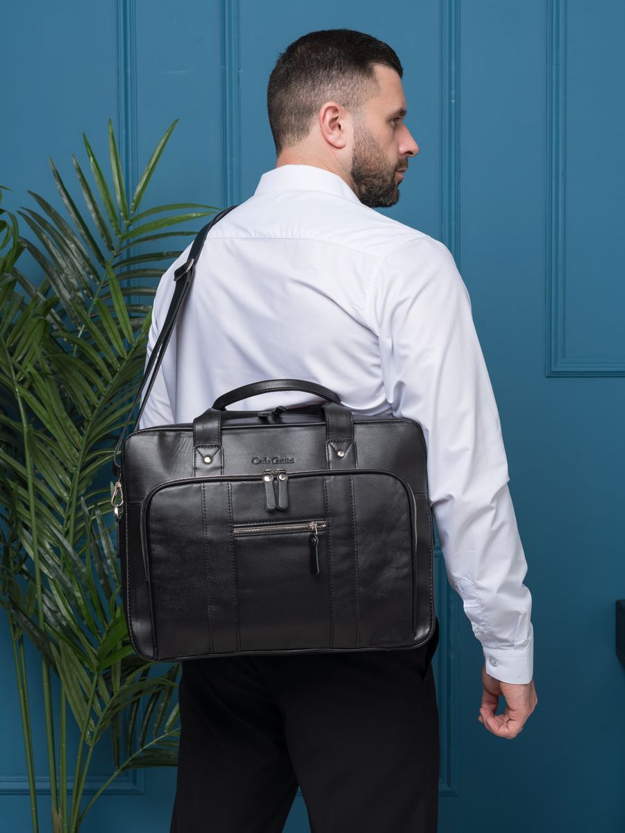Вместительная кожаная сумка для ноутбука Carlo Gattini Ruffo Premium выполнена из премиальной натуральной кожи с естественной лицевой поверхностью. Эта солидная и вместительная сумка состоит из основного отделения, внутри которого есть отделение для ноутбука (помещаются ноутбуки с диагональю до 17 дюймов), карман на молнии и отделения для мелочей и авторучек. В основном отделении возможно разместить ноутбук с диагональю до 17,3 дюймов. На задней стенке: вместительный карман на молнии. На передней: накладной карман на молнии размером 36х24 см, внутри которого также есть карман на молнии. Снаружи есть прорезной карман на молнии. В комплекте есть съемный полностью кожаный плечевой ремень с кожаным наплечником Премиум серию отличают: - Натуральная лицевая кожа высшего качества; - Премиальная фурнитура; - Улучшенное внутреннее пространство. Видеообзор сумки: