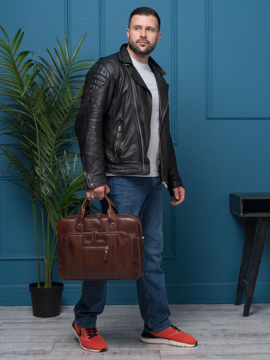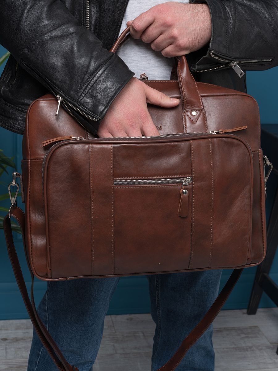 Вместительная кожаная сумка для ноутбука Carlo Gattini Ruffo Premium выполнена из премиальной натуральной кожи с естественной лицевой поверхностью. Эта солидная и вместительная сумка состоит из основного отделения, внутри которого есть отделение для ноутбука (помещаются ноутбуки с диагональю до 17 дюймов), карман на молнии и отделения для мелочей и авторучек. В основном отделении возможно разместить ноутбук с диагональю до 17,3 дюймов. На задней стенке: вместительный карман на молнии. На передней: накладной карман на молнии размером 36х24 см, внутри которого также есть карман на молнии. Снаружи есть прорезной карман на молнии. В комплекте есть съемный полностью кожаный плечевой ремень с кожаным наплечником Премиум серию отличают: - Натуральная лицевая кожа высшего качества; - Премиальная фурнитура; - Улучшенное внутреннее пространство. Видеообзор сумки:
