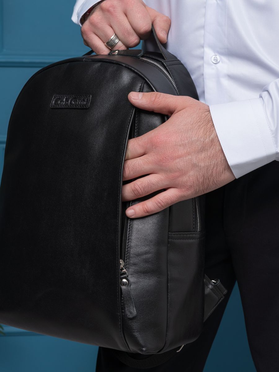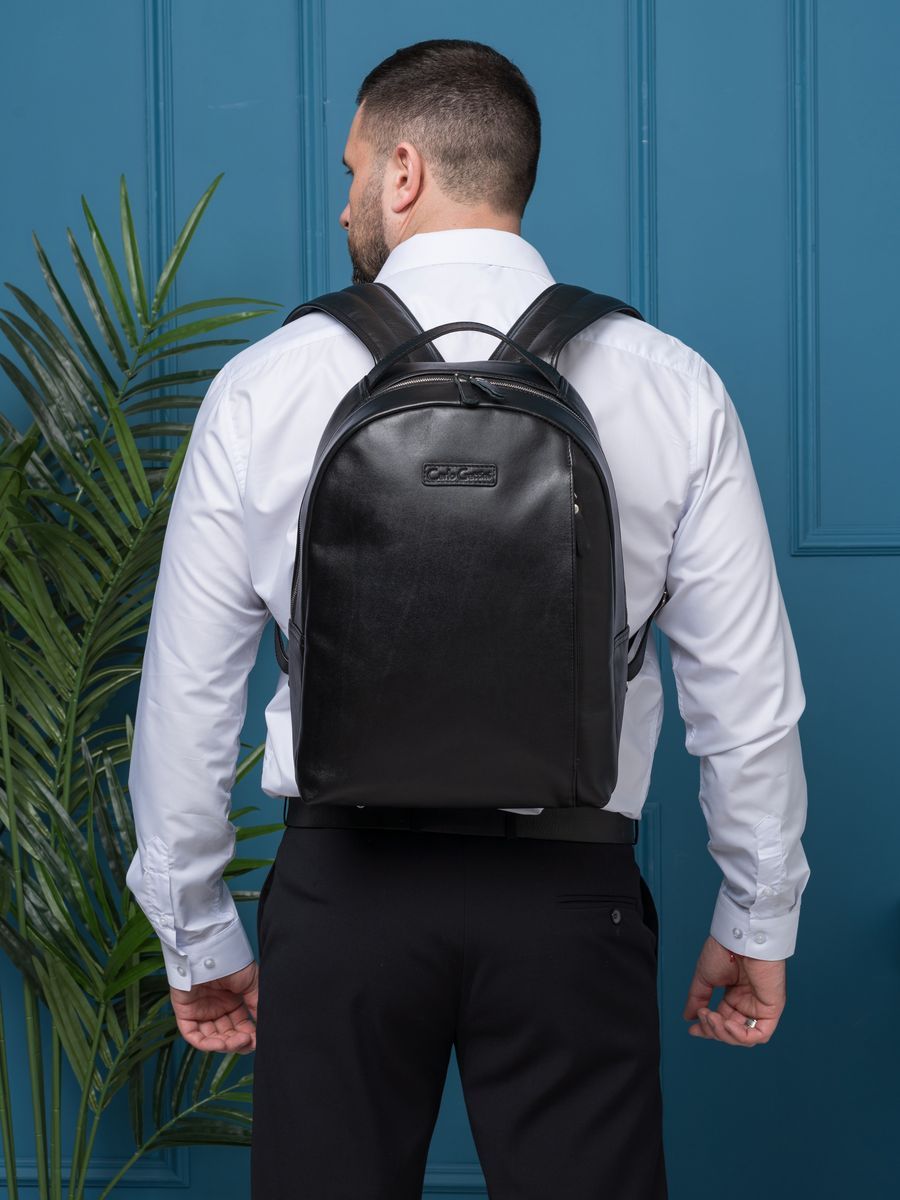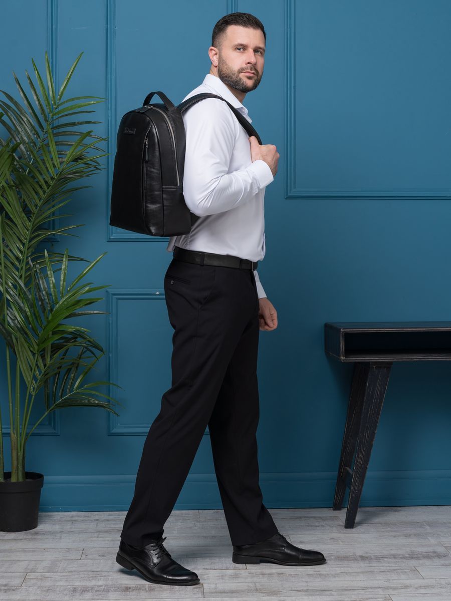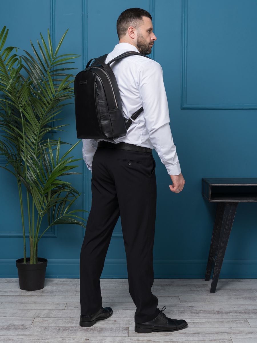 Кожаный рюкзак Ferramonti (Феррамонти) выполнен из премиальной натуральной кожи черного цвета. Это классический лаконичный рюкзак среднего размера, идеально подходит для ежедневной эксплуатации. Сочетается с любой одеждой. Состоит из основного отделения, внутри которого 2 открытых кармана, карман на молнии и отделение для ноутбука с диагональю до 14 дюймов. Спереди есть вместительный карман на молнии, внутри которого открытый карман-сетка и карман на молнии. Спинка сделана полностью из натуральной кожи и уплотнена. На спинке есть крепление на ручку чемодана. Лямки шириной 7 см регулируются по длине, сделаны мягкими с вентилируемой сеткой сзади. Видеобзор рюкзака: