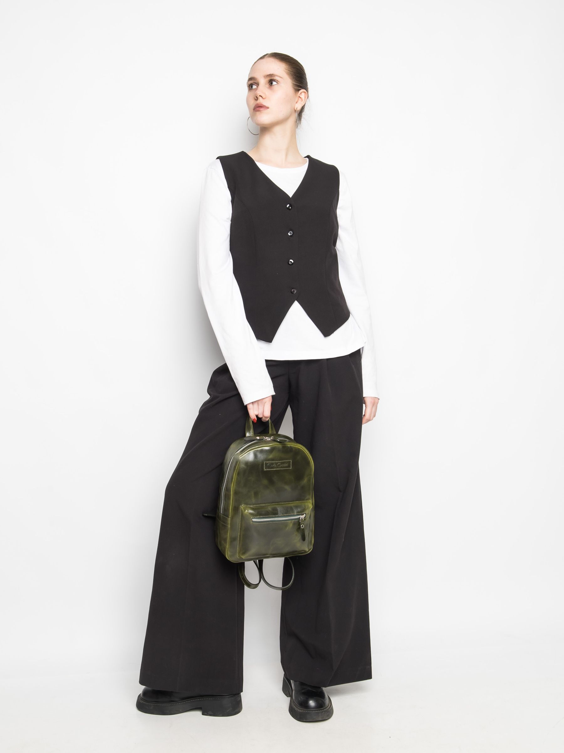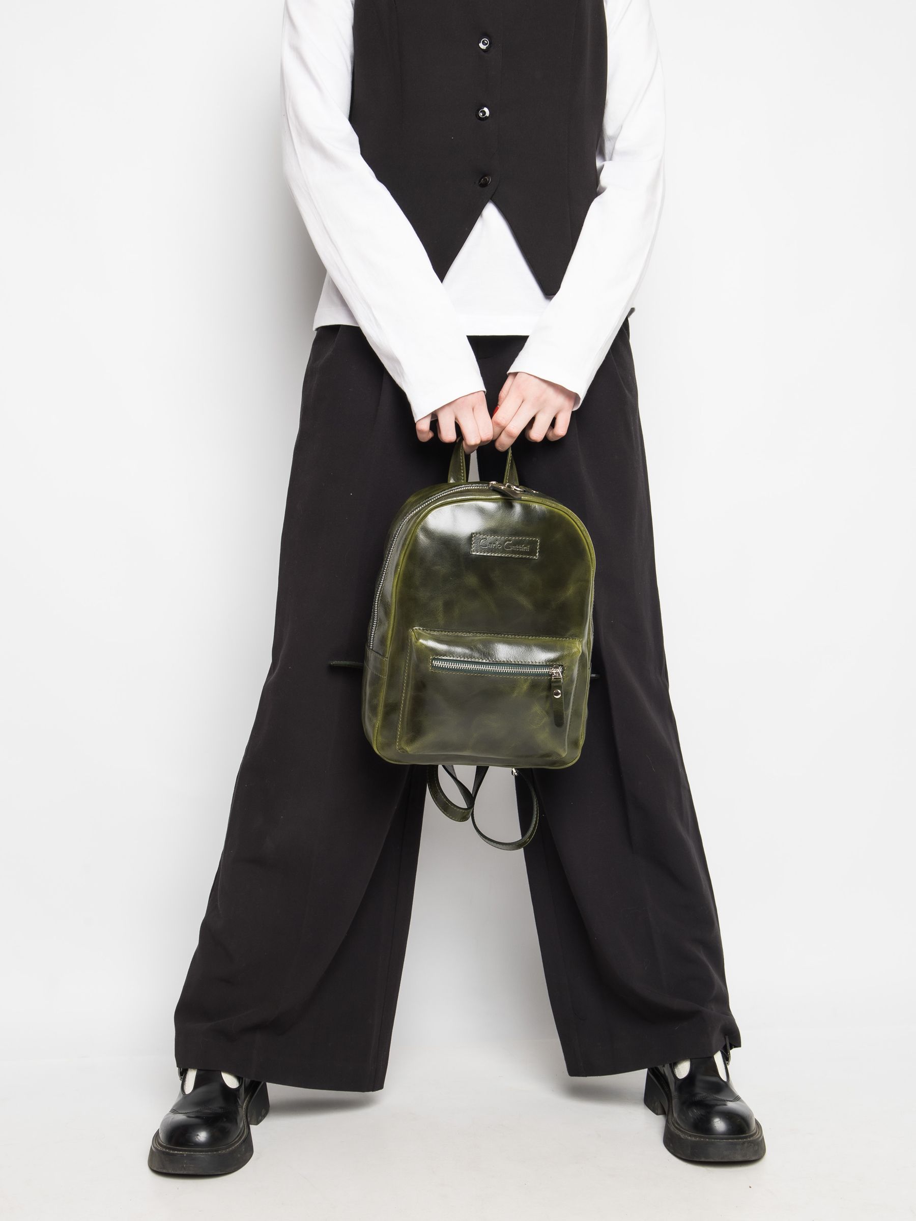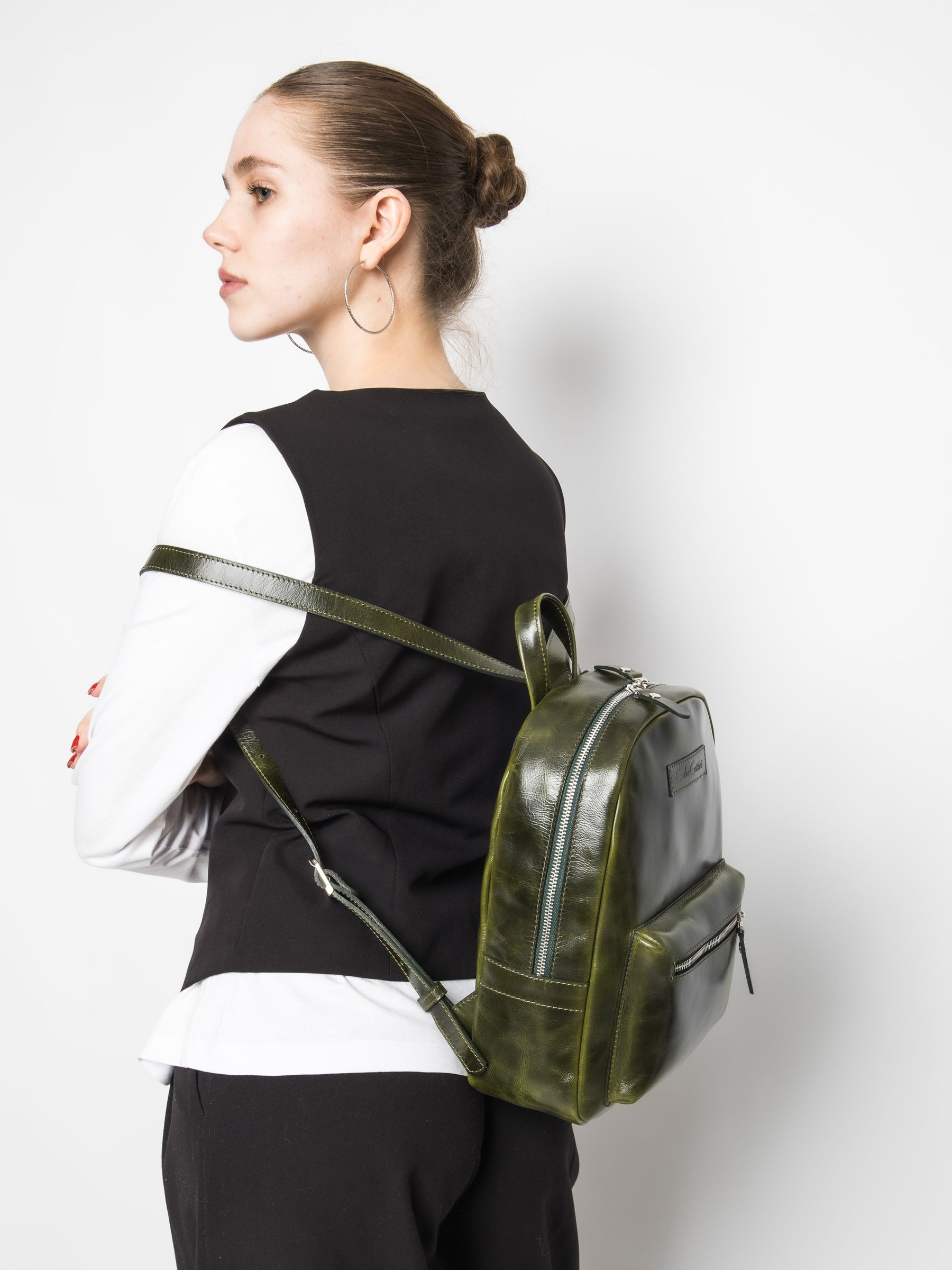 Женский кожаный рюкзак Anzolla (Анцолла) выполнен из натуральной кожи темно-зеленого цвета. Состоит из основного отделения на молнии, внутри которого находится отделение на молнии и отделения для мелочей. Спереди накладной карман. Сзади - карман на молнии. Молнии металлические. Рюкзак выполнен полностью без подклада. Видеообзор рюкзака: