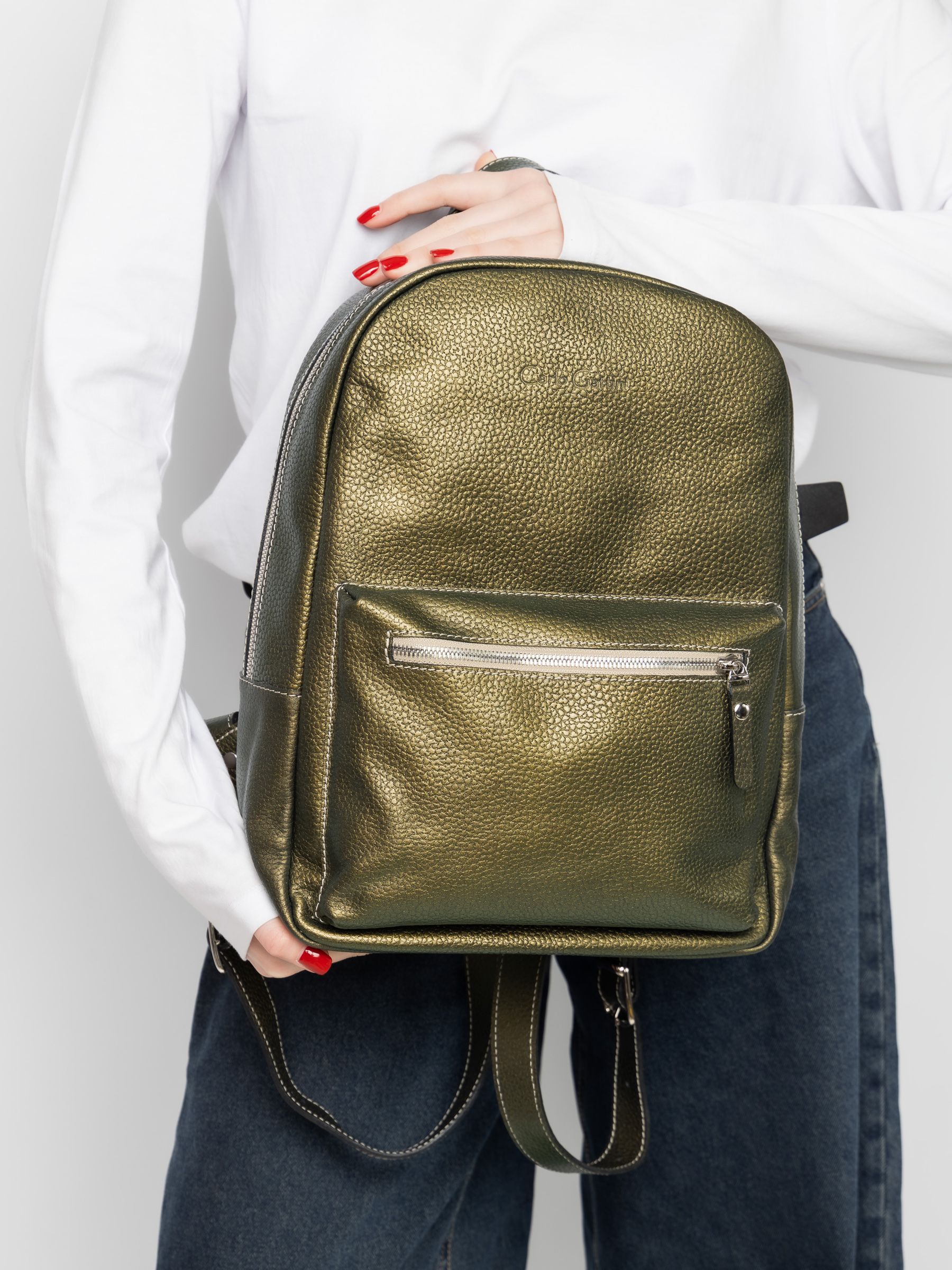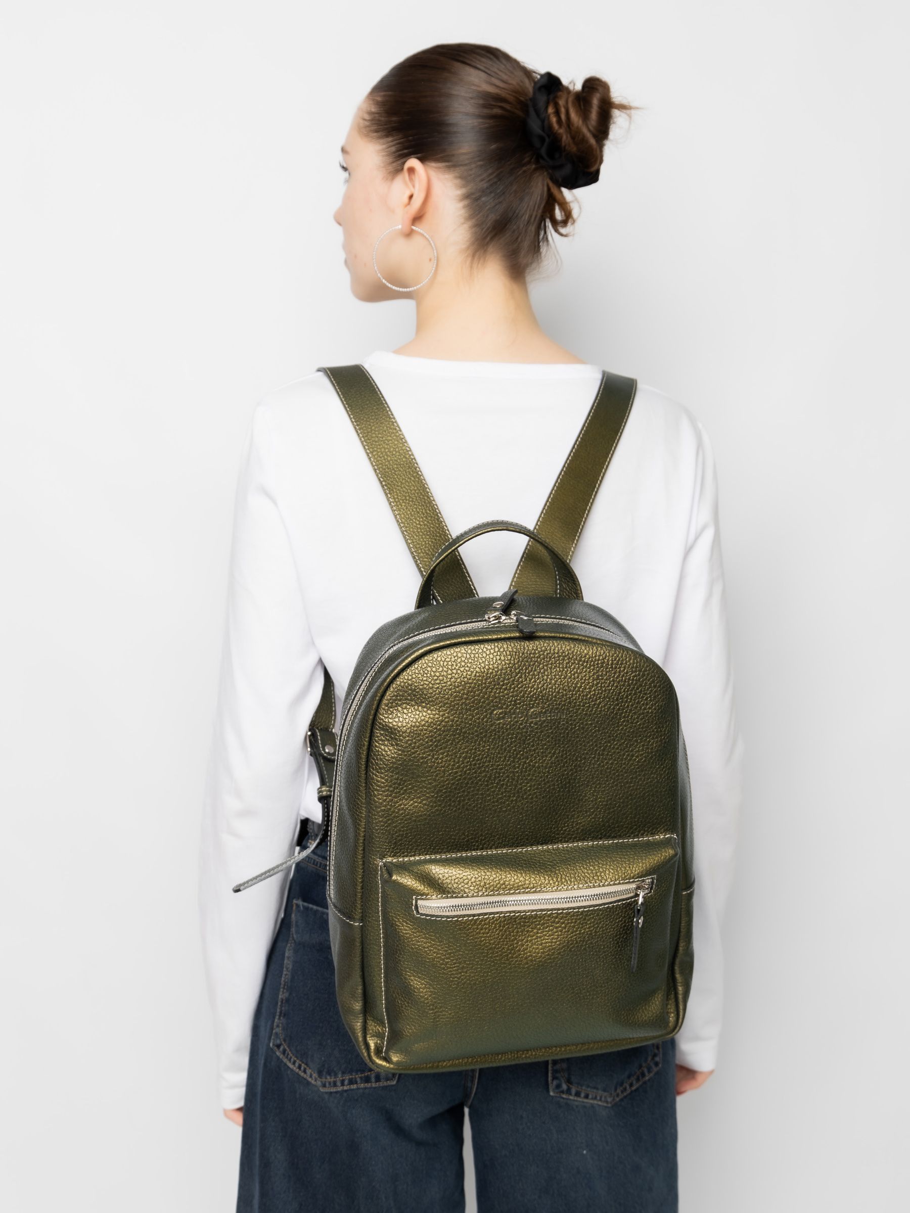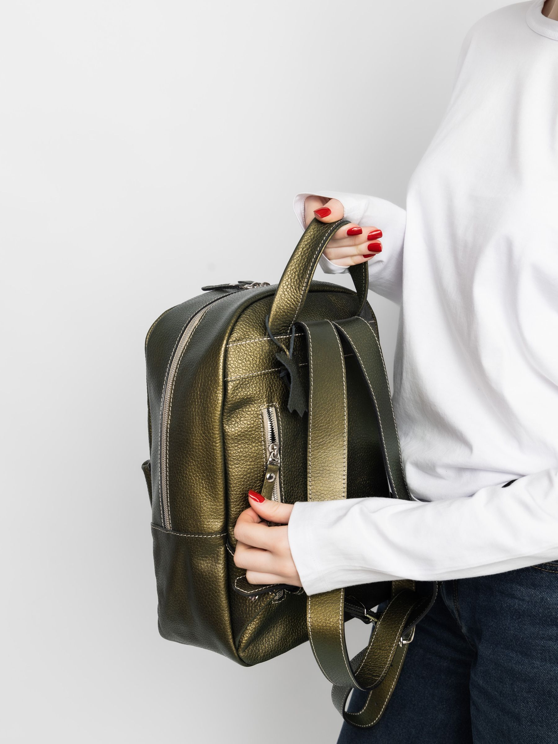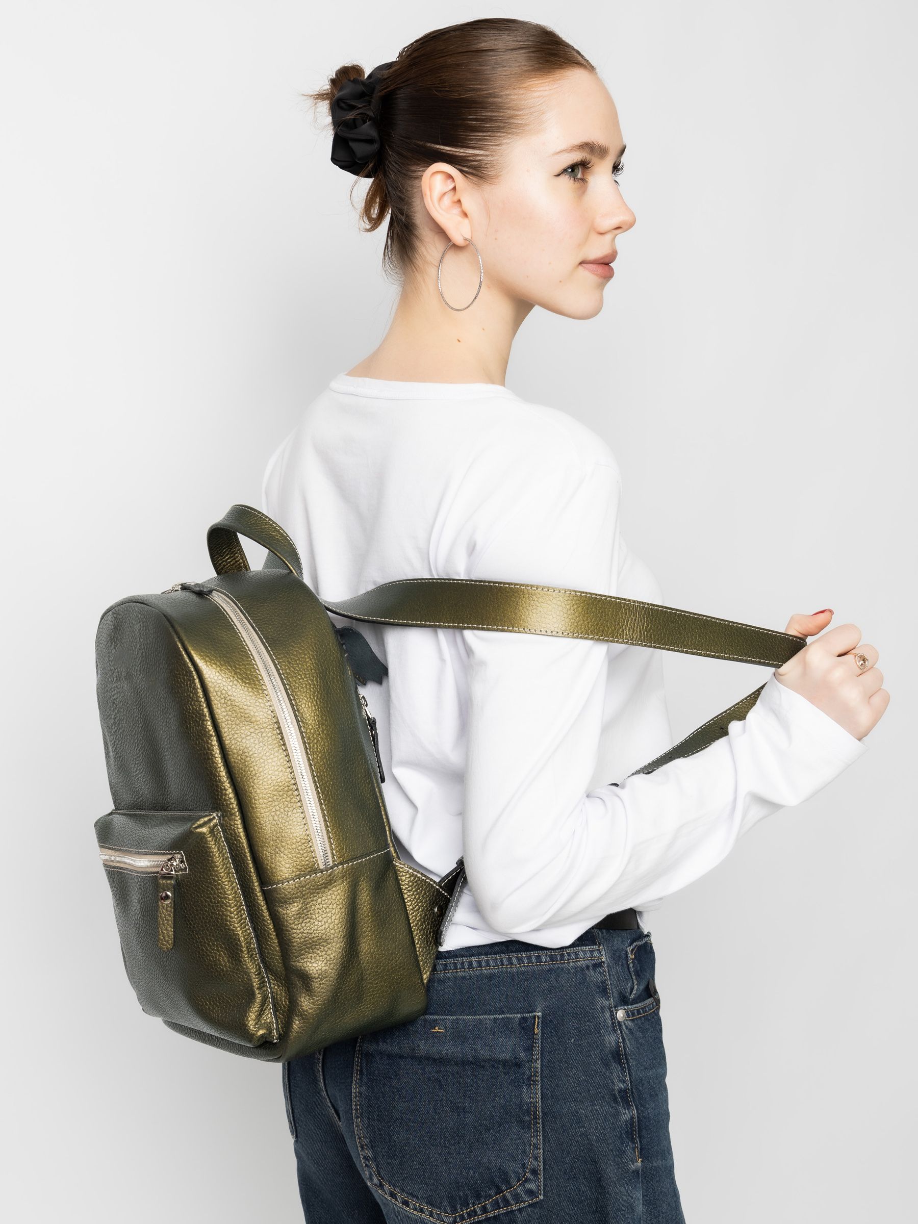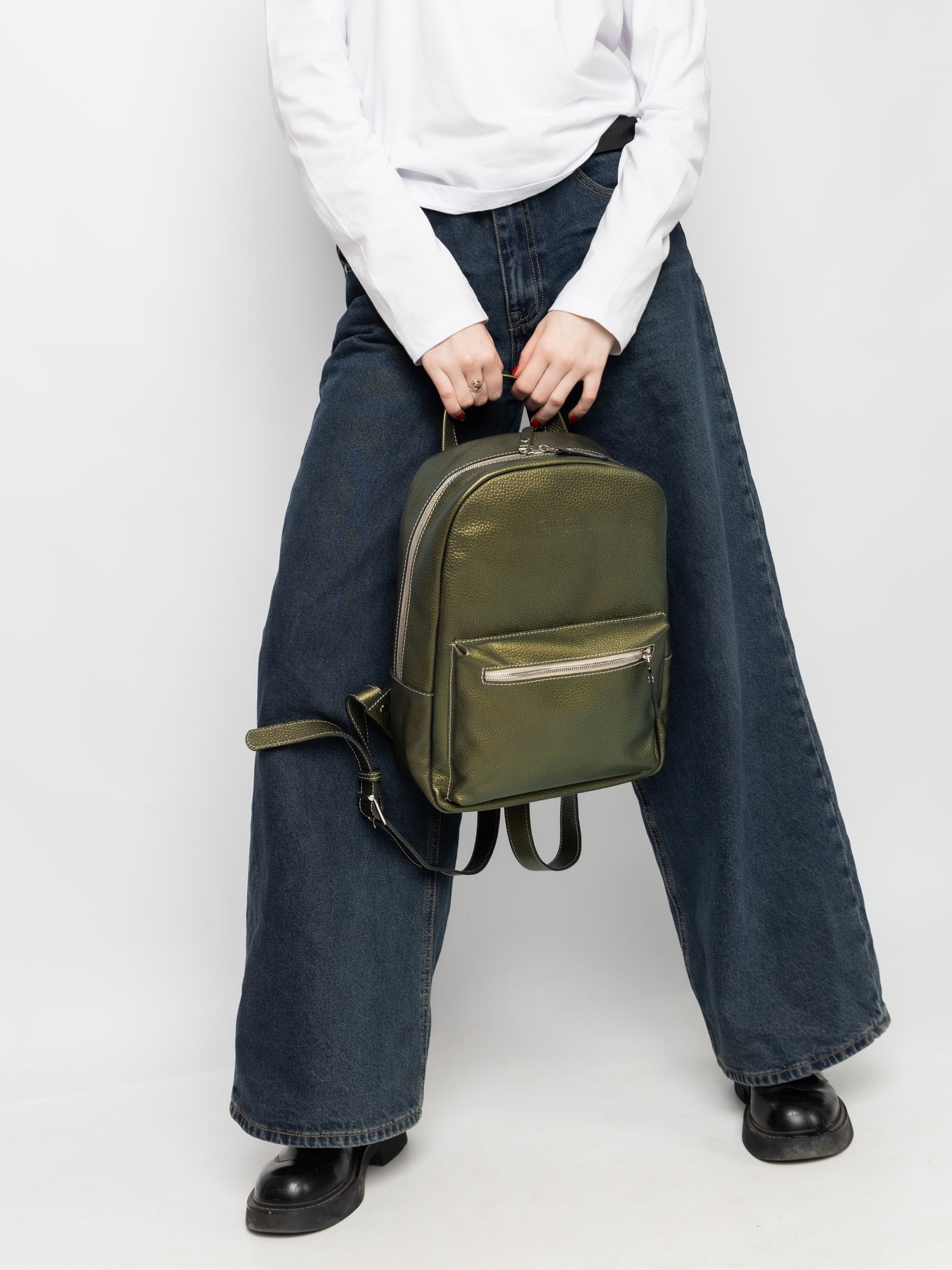 Женский кожаный рюкзак Albiate (Альбиате) выполнен из натуральной кожи цвета "золотой киви" (золотой-зеленый) с эффектом "Хамелеон". Состоит из основного отделения на молнии, внутри которого находятся 2 открытых кармана для папок А4 и карман на молнии. Спереди накладной карман. Сзади - карман на молнии. Ширина лямок - 4 см. Молнии металлические. Видеообзор рюкзака: