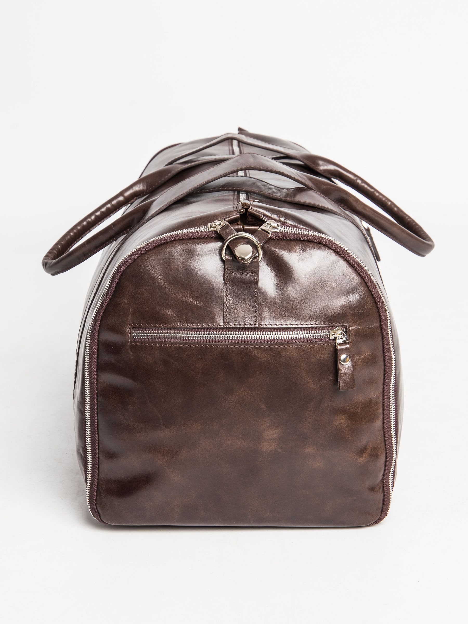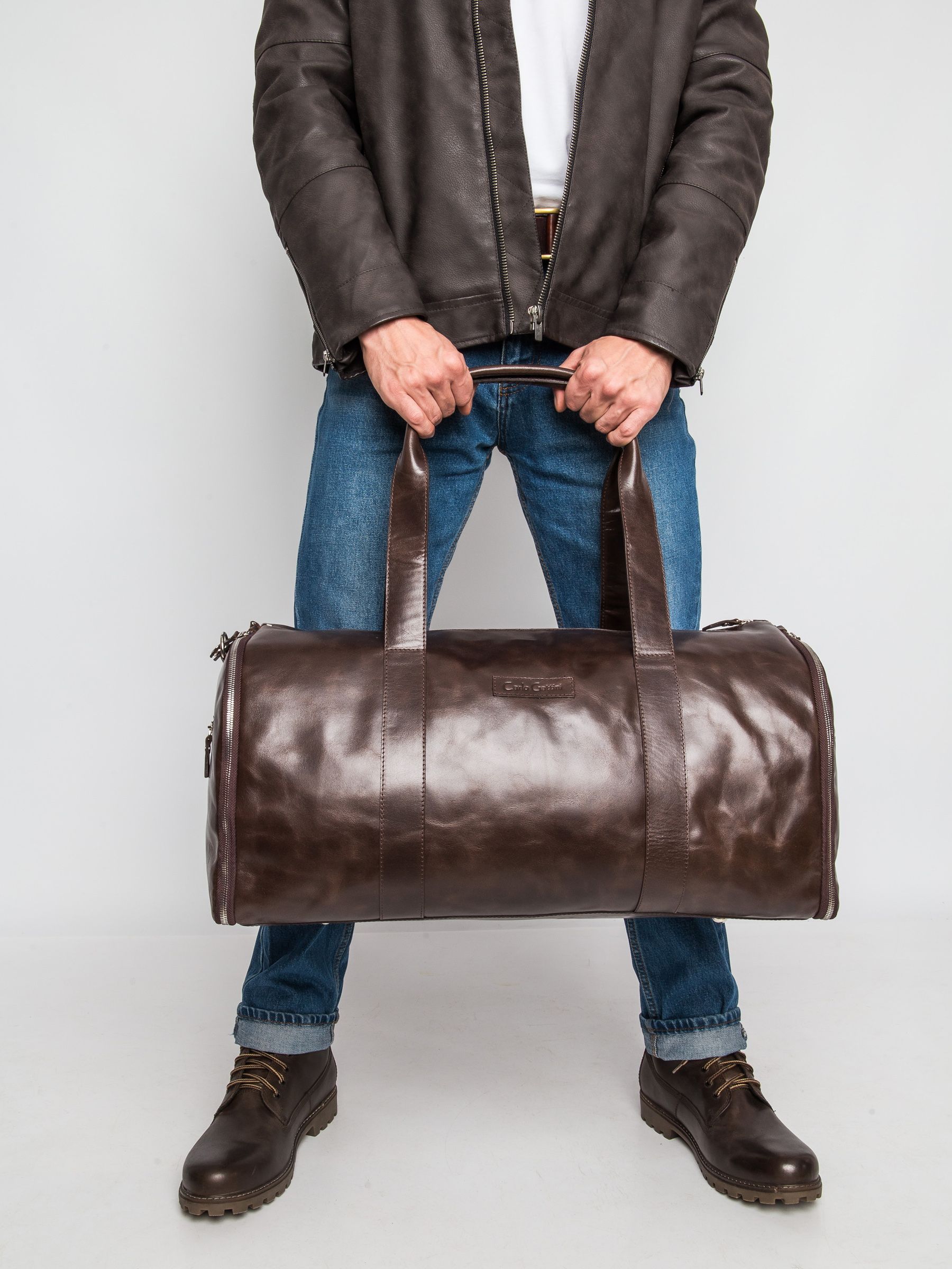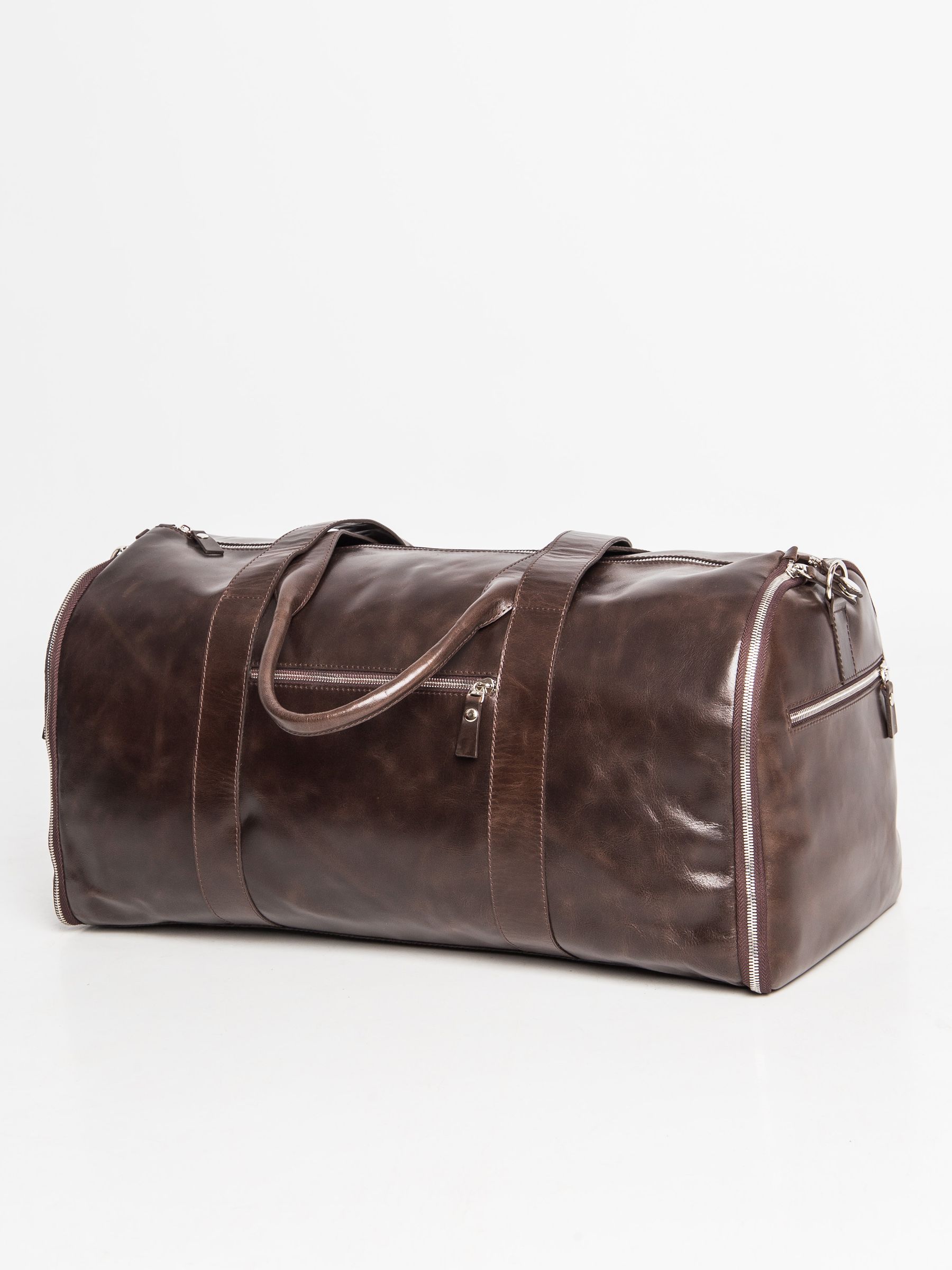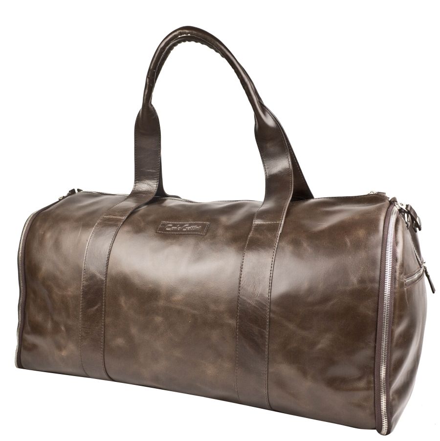 Портплед Carlo Gattini Torino (Торино) выполнен из премиальной натуральной кожи темно-коричневого цвета. Это портплед, выполненный в виде дорожной сумки. Очень удобный и уникальный дизайн. Состоит из одного большого отделения, внутри которого есть отсек для костюма (размер 85х52 см), два кармана на молнии два кармана в боковых стенках. По бокам два отделения на молнии. Сзади - карман на молнии. На дне металлические ножки, в комплекте есть съемный кожаный плечевой ремень. Видеобзор сумки: