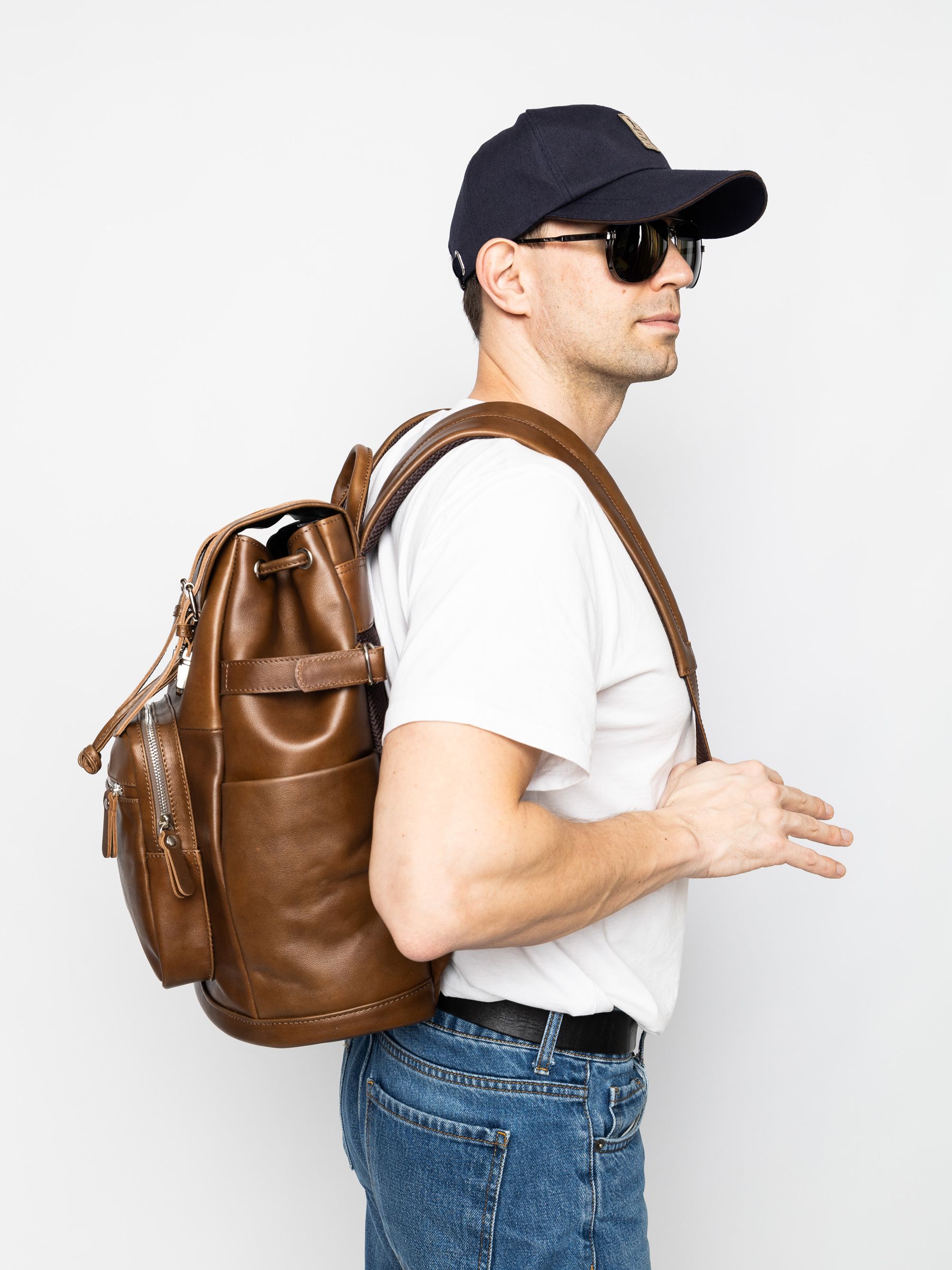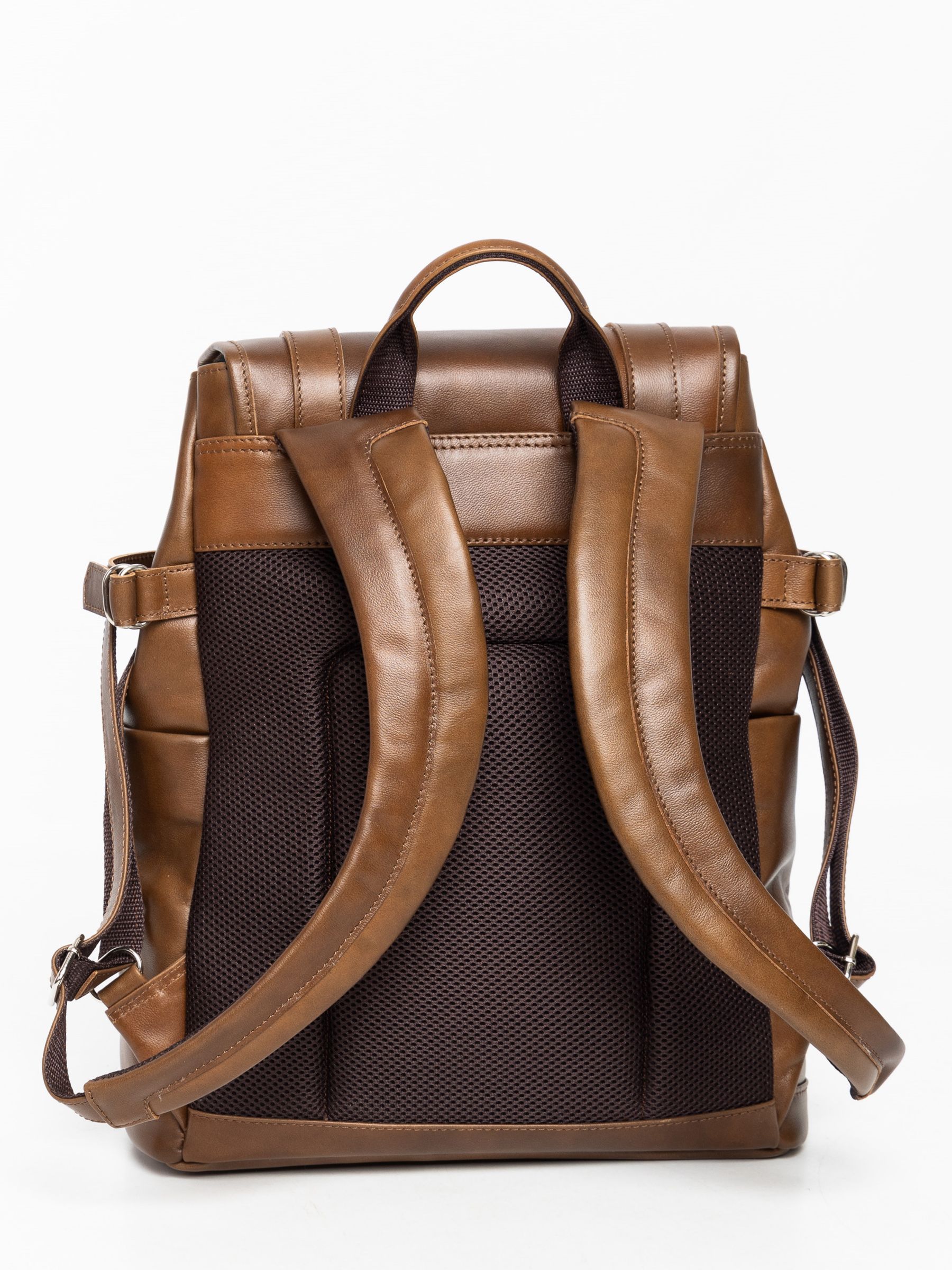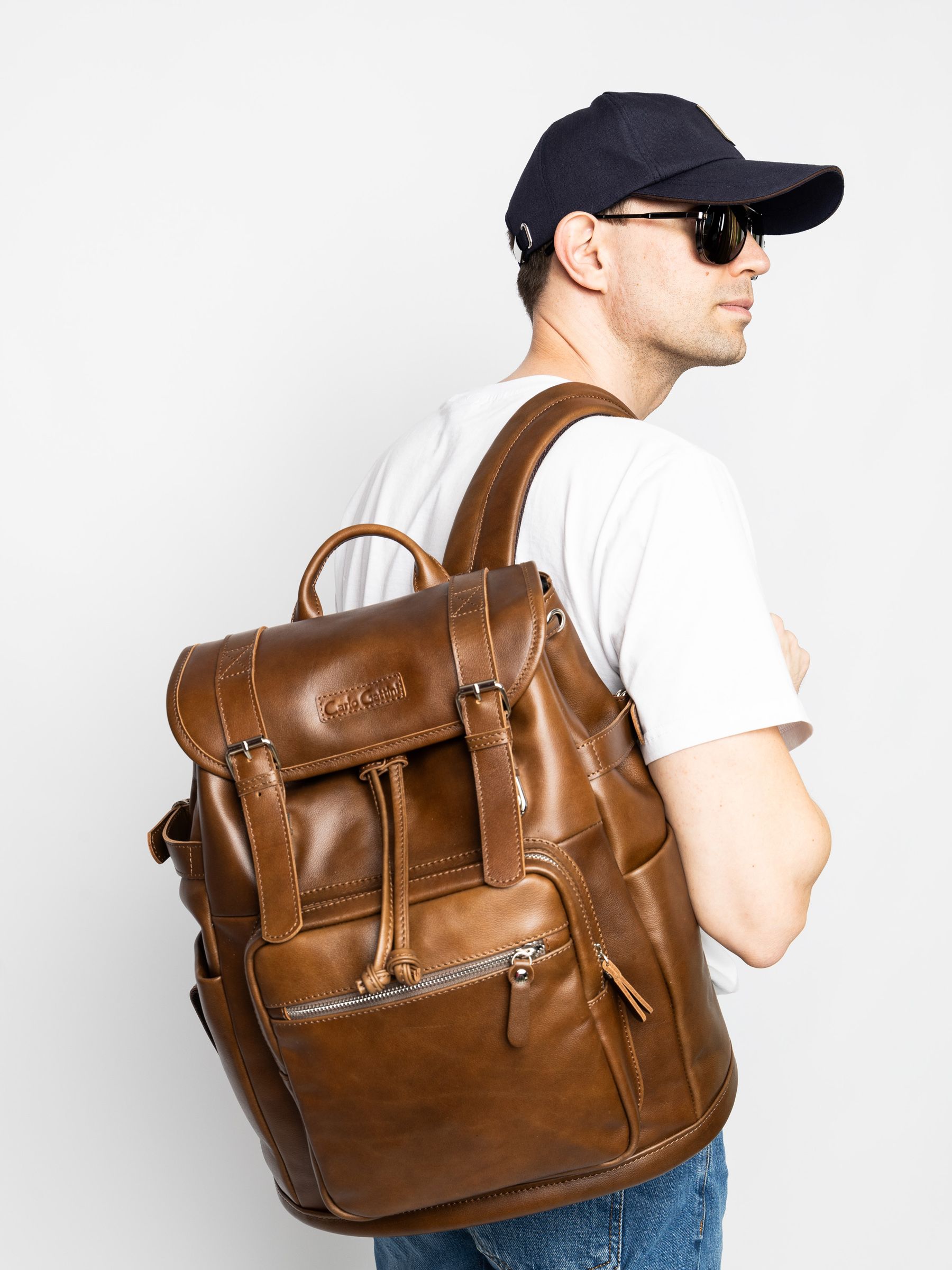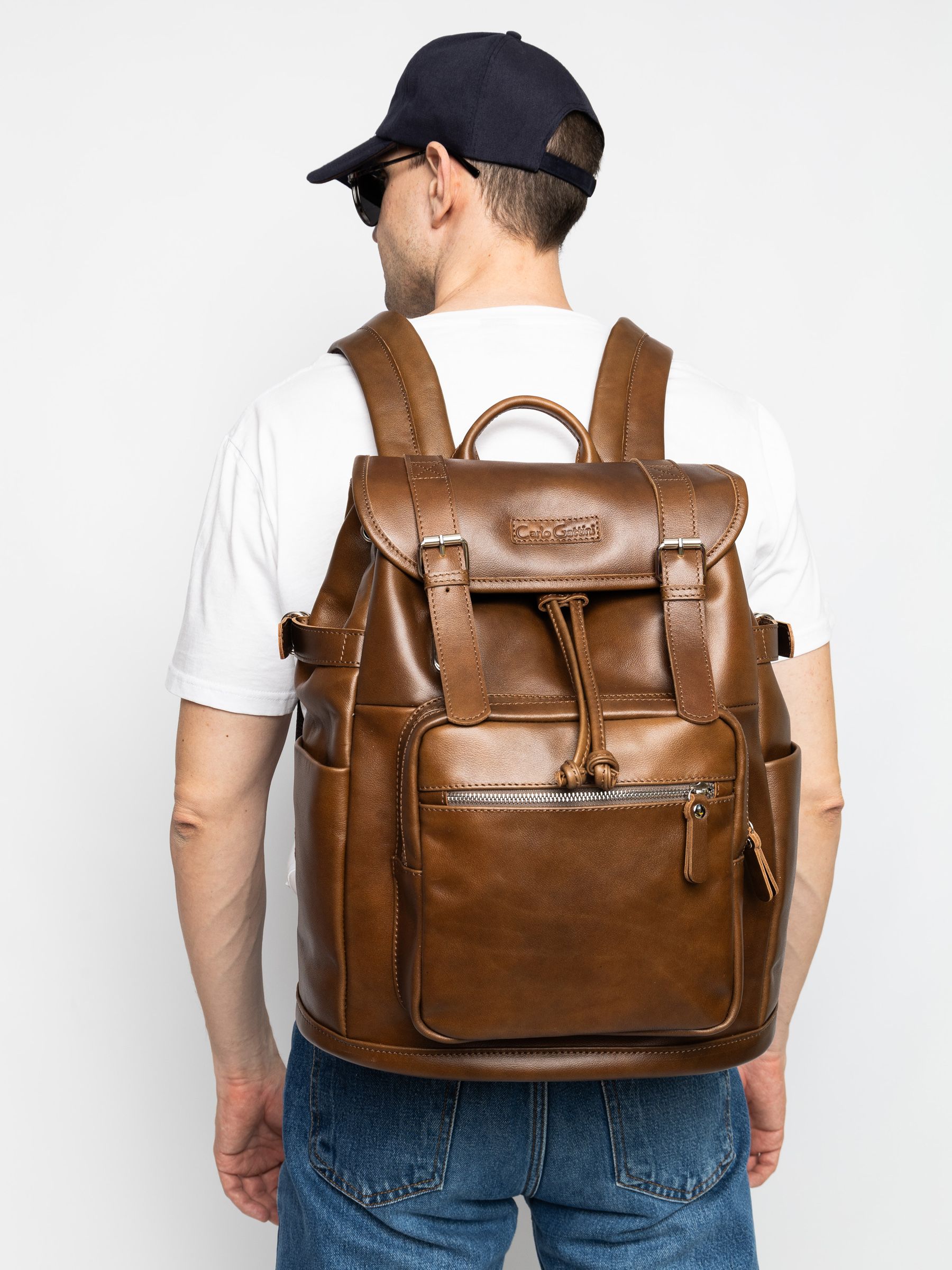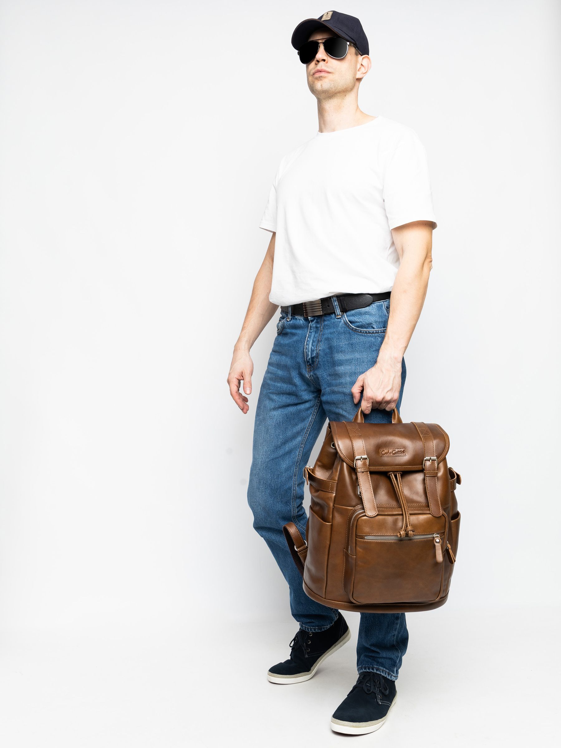 Мужской классический кожаный рюкзак Carlo Gattini Volturno (Вольтурно) NEW выполнен из натуральной кожи коричневого цвета. У этого кожаного рюкзака одно большое отделение, которое затягивается ремешком и закрывается клапаном на замках. Внутри отделения есть карман на молнии и отделение для ноутбука до 14 дюймов. В рюкзак помещается ноутбук с диагональю до 15.6 дюймов, но лучше его там носить в чехле и вместе с другими вещами. Снаружи два кармана на молнии. Размер внешнего кармана на молнии: 24х25 см. По бокам открытые карманы. Лямки - мягкие анатомические, спинка сделана из вентилируемого материала AirMesh. Видеообзор рюкзака: