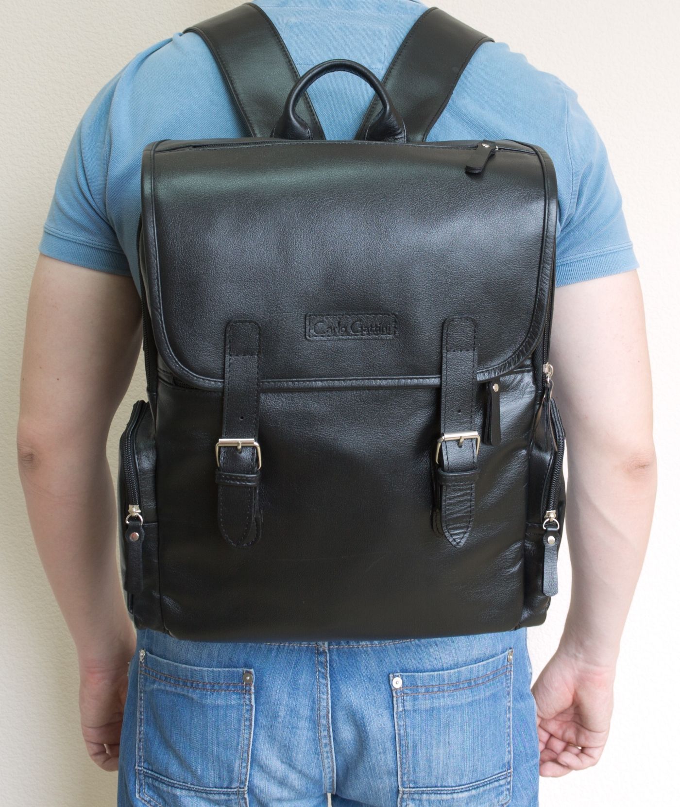 Кожаный рюкзак для ноутбука Santerno (Сантерно) выполнен из высококачественной натуральной кожи черного цвета. Рюкзак имеет два основных и независимых отделения на молнии под общим клапаном. Прорезные карманы на молнии на клапане и под клапаном. Два накладных кармана по бокам. Отделение, которое находится ближе к спине сделано специально для ноутбука. Внутри него есть отделение для небольшого устройства (около 10 дюймов), а ноутбук побольше (до 15 дюймов) кладется рядом. Лямки специально упрочнены и имеют ширину 6 см. Видеообзор рюкзака: