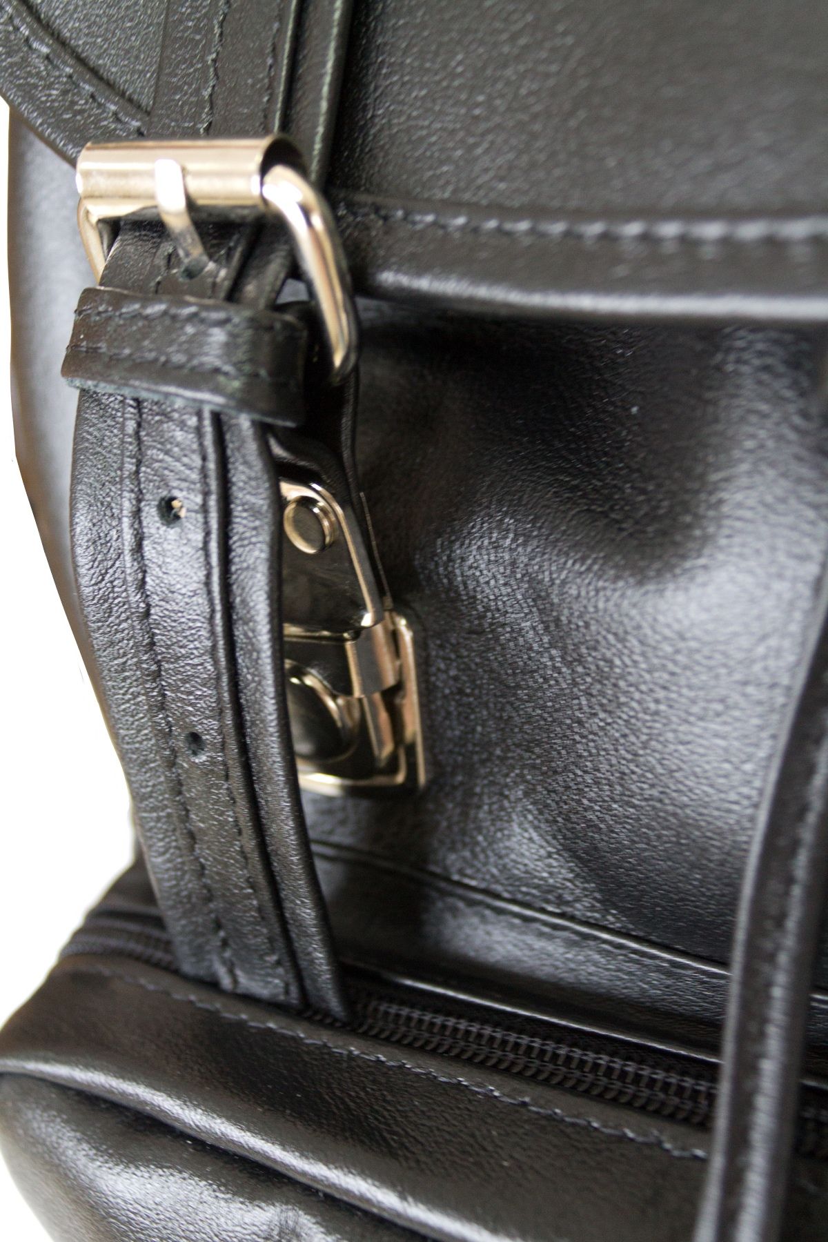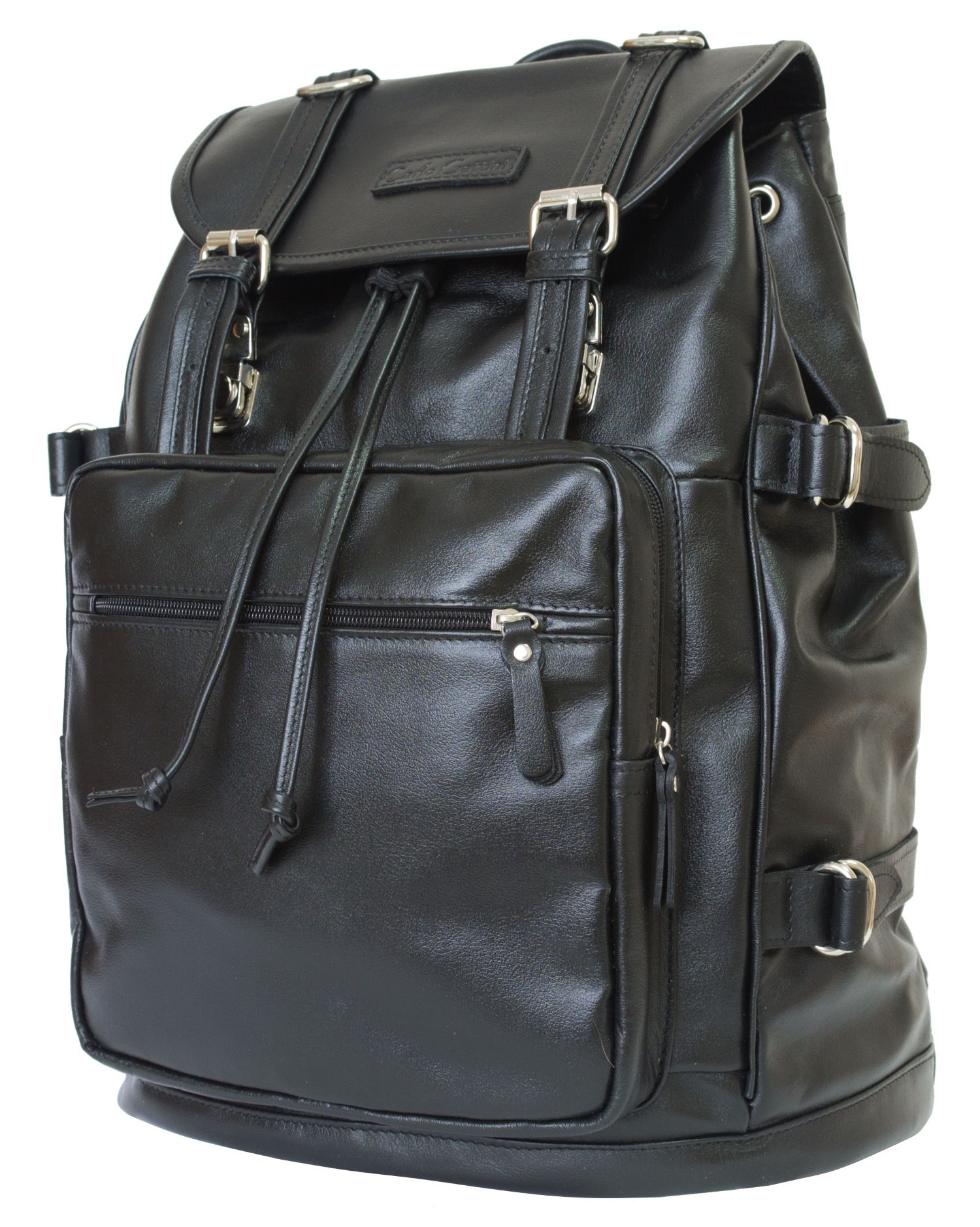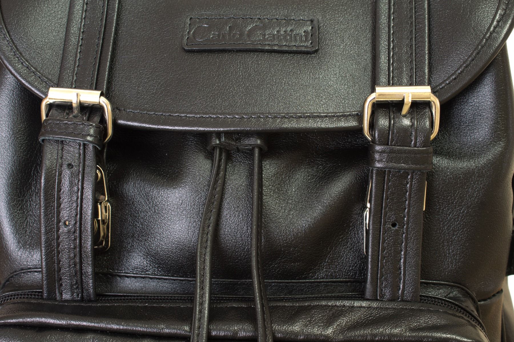 Мужской классический кожаный рюкзак Carlo Gattini Volturno (Вольтурно) выполнен из высококачественной натуральной кожи черного цвета. У этого кожаного рюкзака одно большое отделение, которое затягивается ремешком и закрывается клапаном на замках. Внутри отделения есть карман на молнии и отделения для мелочей. В основное отделение есть доступ сбоку через молнию. В кожаный рюкзак помещается ноутбук с диагональю до 15.6 дюймов, но лучше его там носить в чехле и вместе с другими вещами. Снаружи два кармана на молнии. Размер внешнего кармана на молнии: 24х25 см. [ http://kvalito.ru/articles/46 ] Видеообзор рюкзака: