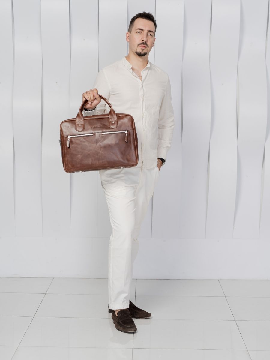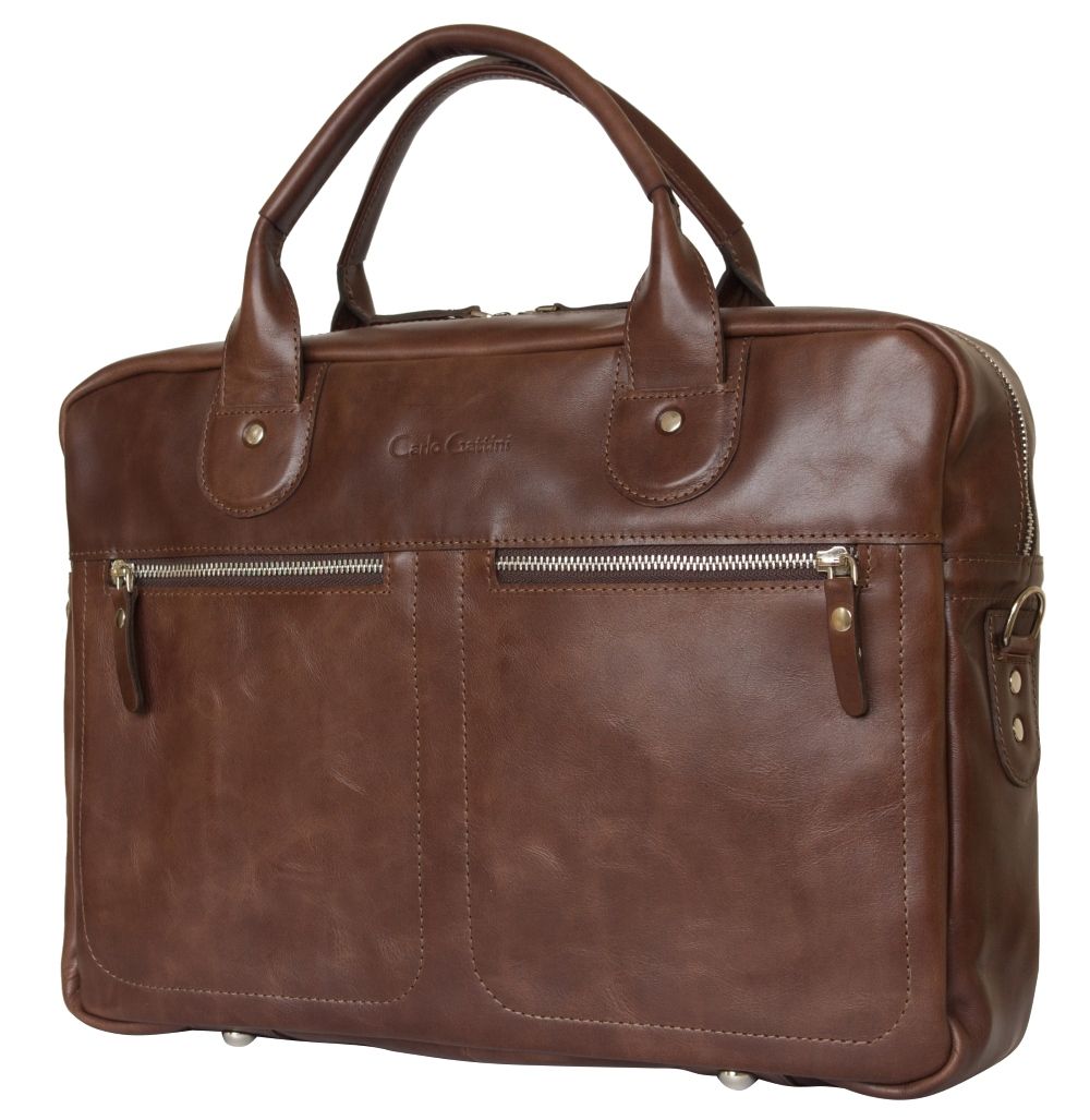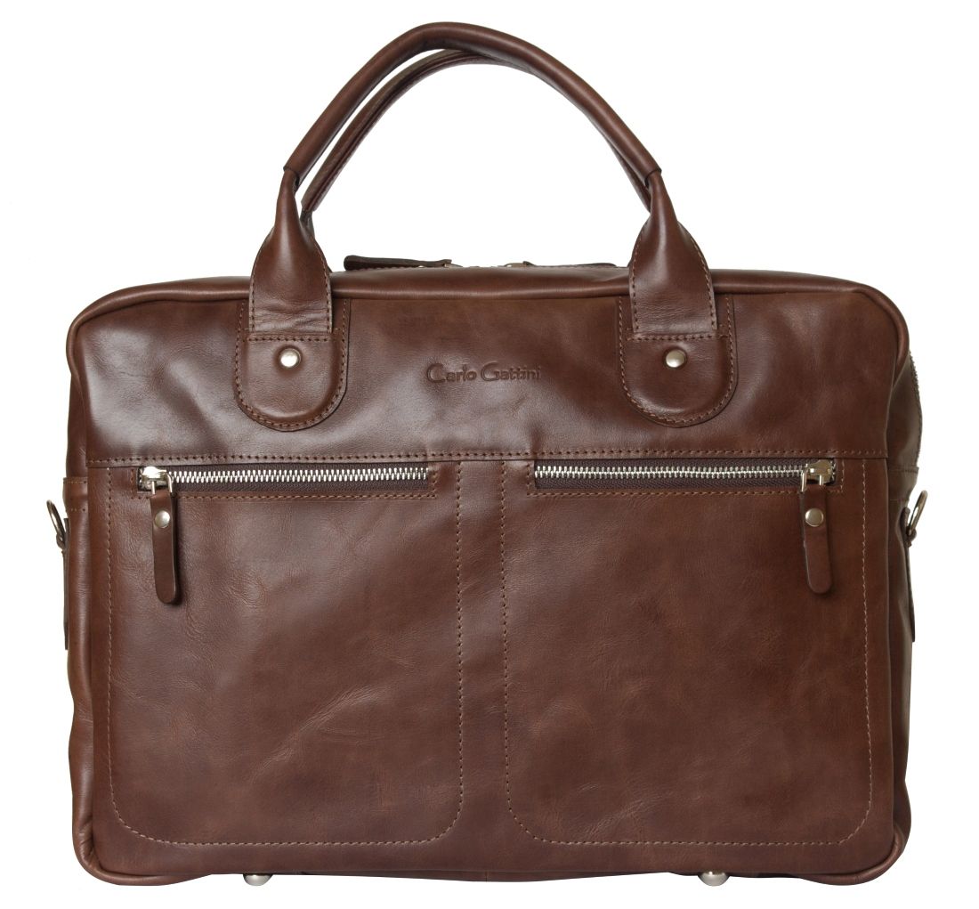 Кожаная сумка для ноутбука Carlo Gattini Fratello (Фрателло) выполнена из натуральной кожи темно-коричневого цвета. Состоит из основного отделения на молнии, внутри которого есть 3 открытых небольших кармашка и съемная перегородка для ноутбука с диагональю до 14 дюймов. На задней стенке: карман на молнии. На передней: два кармана на молнии Сумка выполнена без тканевого подклада, все внутреннее пространство отделано натуральной кожей. Молнии металлические. В комплекте есть съемный кожаный наплечный ремень. Видеобзор сумки: