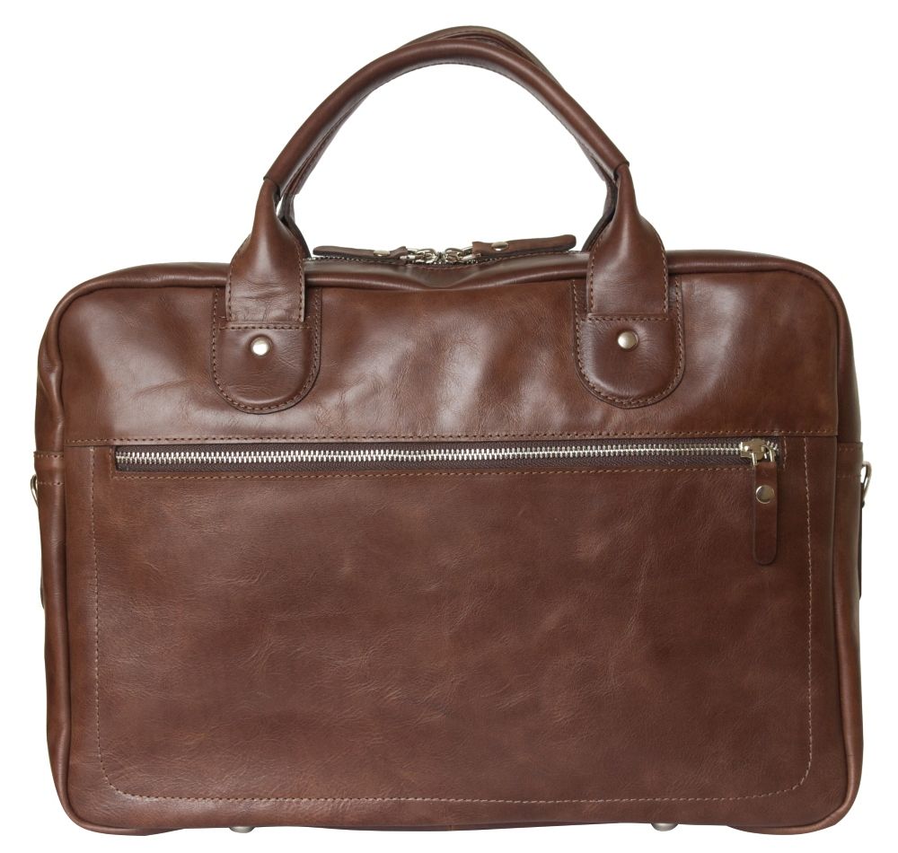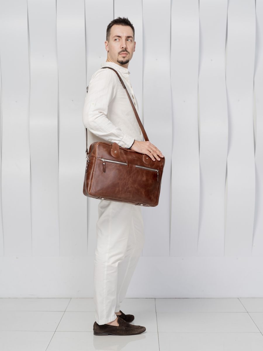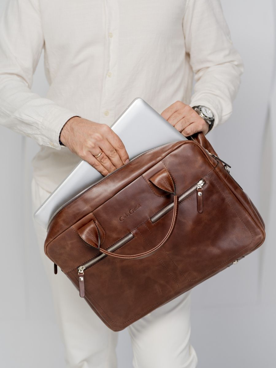 Кожаная сумка для ноутбука Carlo Gattini Fratello (Фрателло) выполнена из натуральной кожи темно-коричневого цвета. Состоит из основного отделения на молнии, внутри которого есть 3 открытых небольших кармашка и съемная перегородка для ноутбука с диагональю до 14 дюймов. На задней стенке: карман на молнии. На передней: два кармана на молнии Сумка выполнена без тканевого подклада, все внутреннее пространство отделано натуральной кожей. Молнии металлические. В комплекте есть съемный кожаный наплечный ремень. Видеобзор сумки: