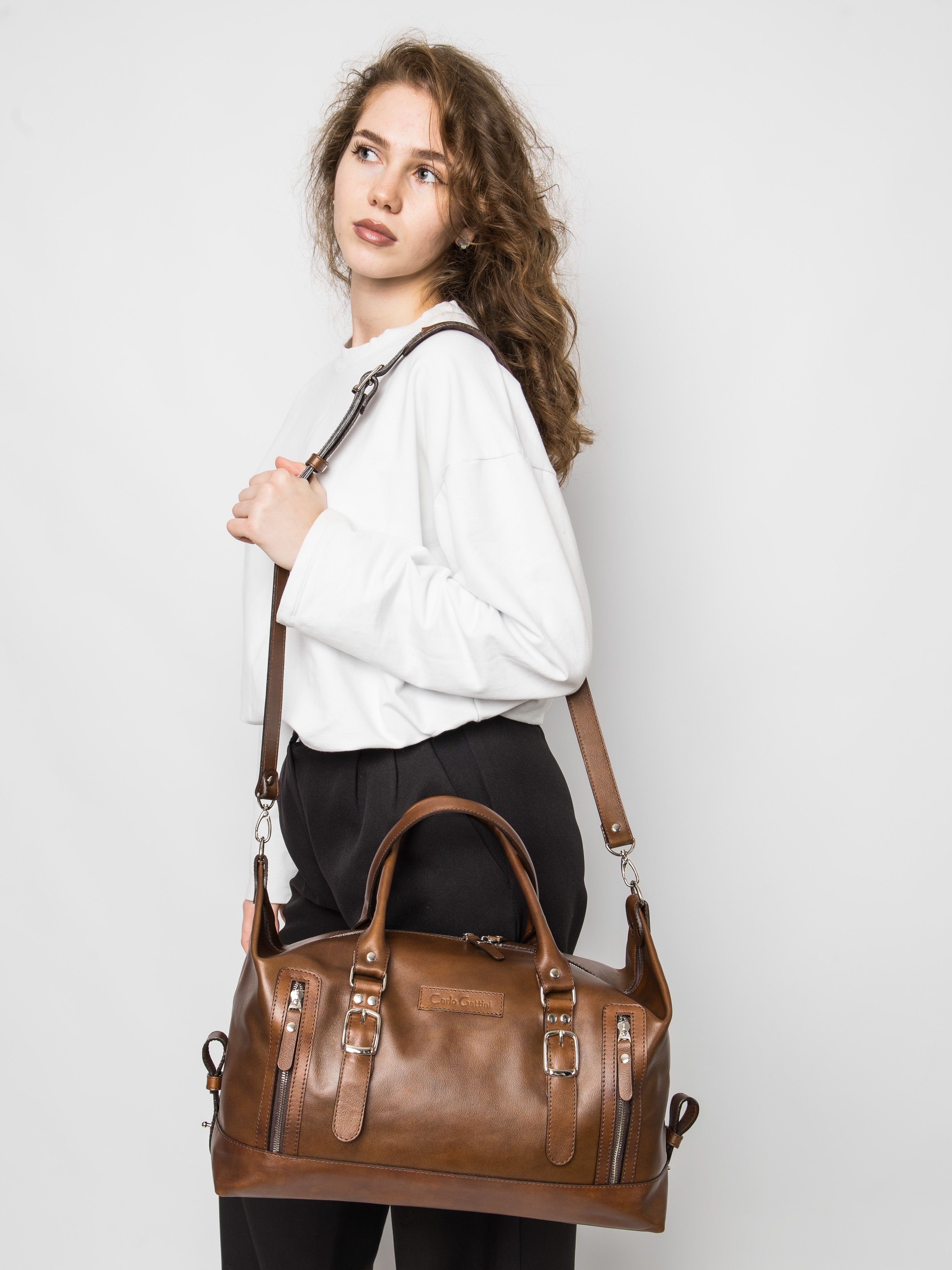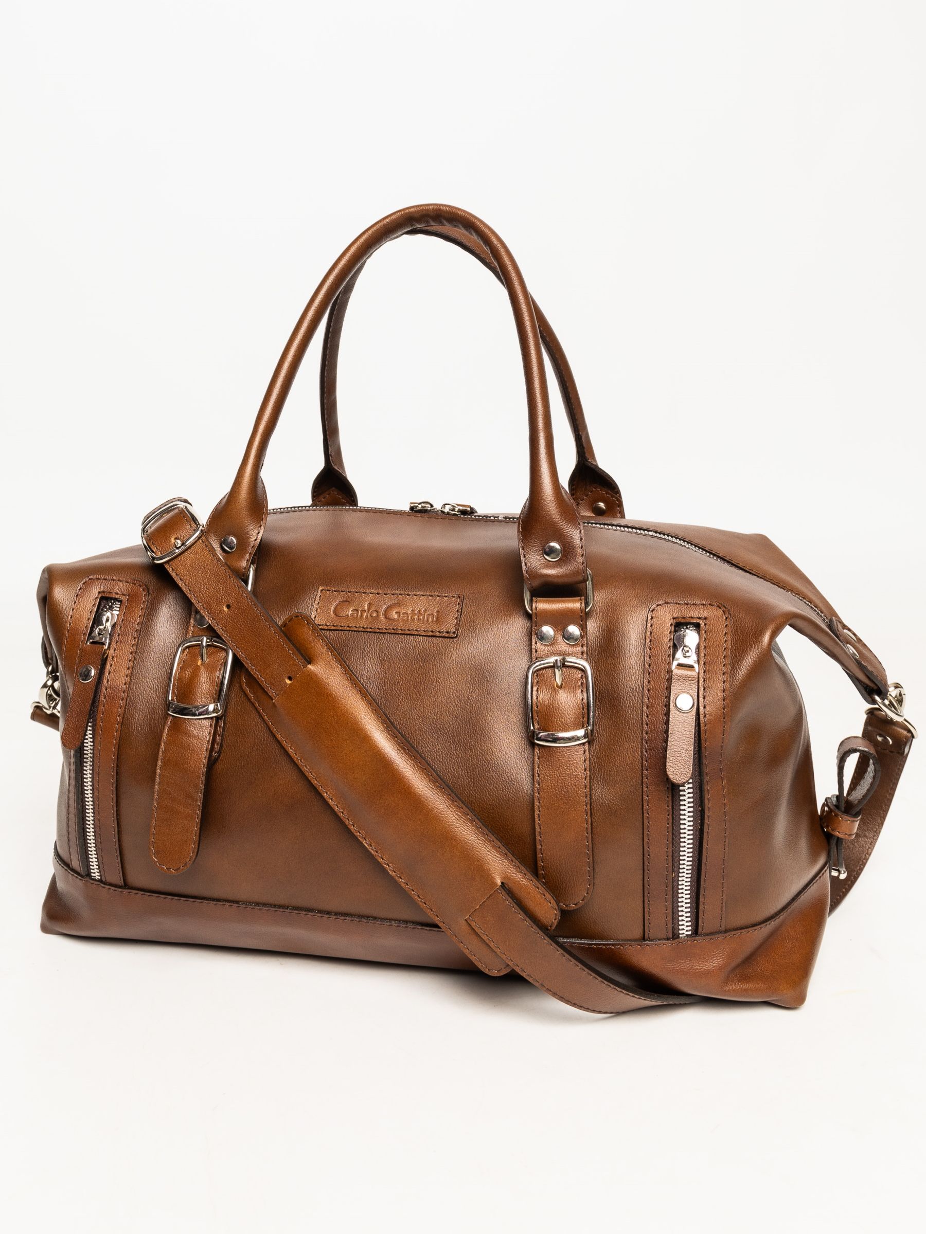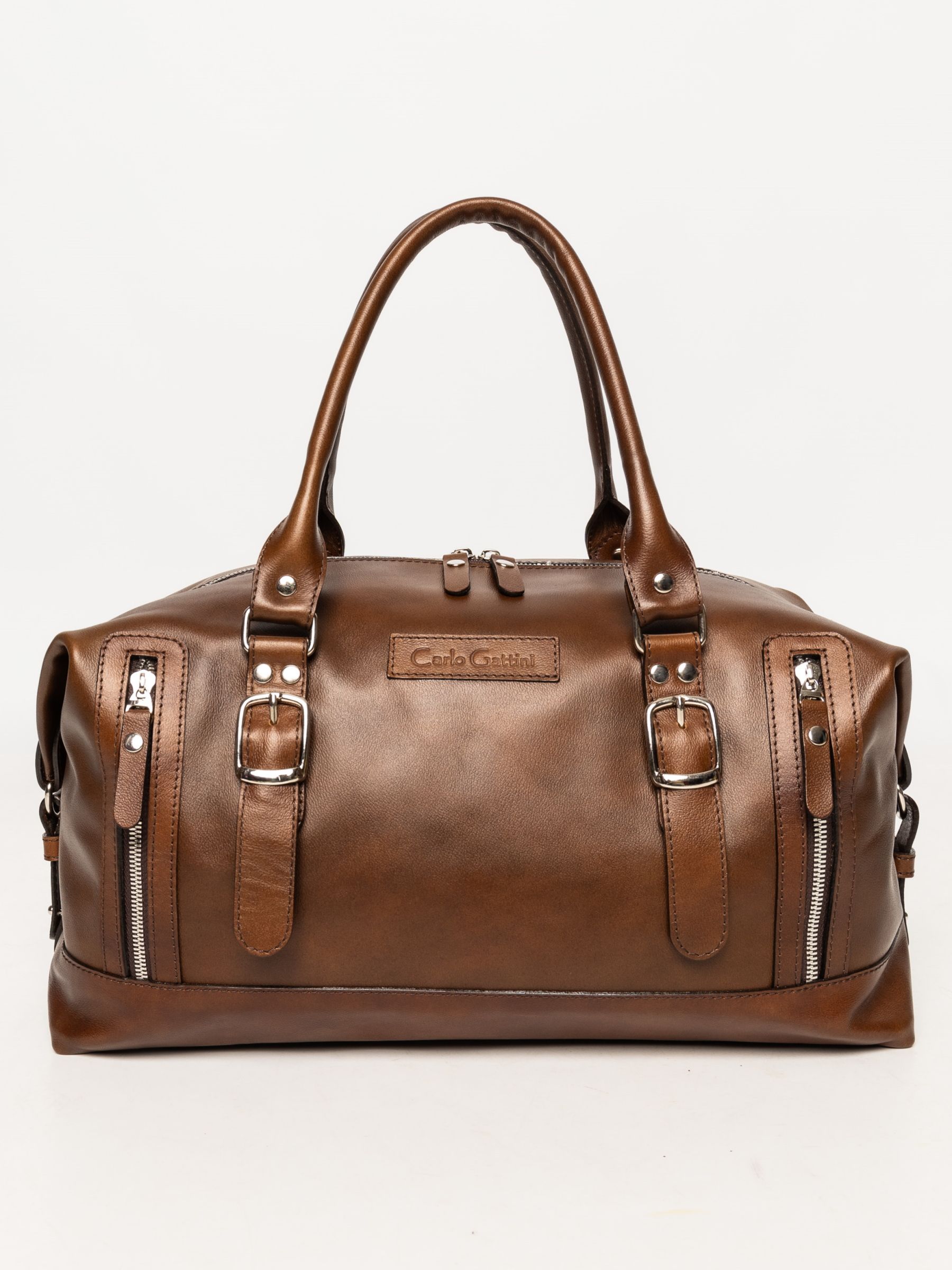 Дорожная сумка Carlo Gattini Ravenna Premium (Равенна) выполнена из натуральной премиальной лицевой кожи коричневого цвета. Эта небольшая дорожная сумка состоит из основного отделения, внутри которого карман на молнии и открытый карман. Спереди два кармана на молнии. В комплекте идет регулируемый плечевой ремень. Премиум серию отличают: - Натуральная лицевая кожа высшего качества; - Премиальная фурнитура;